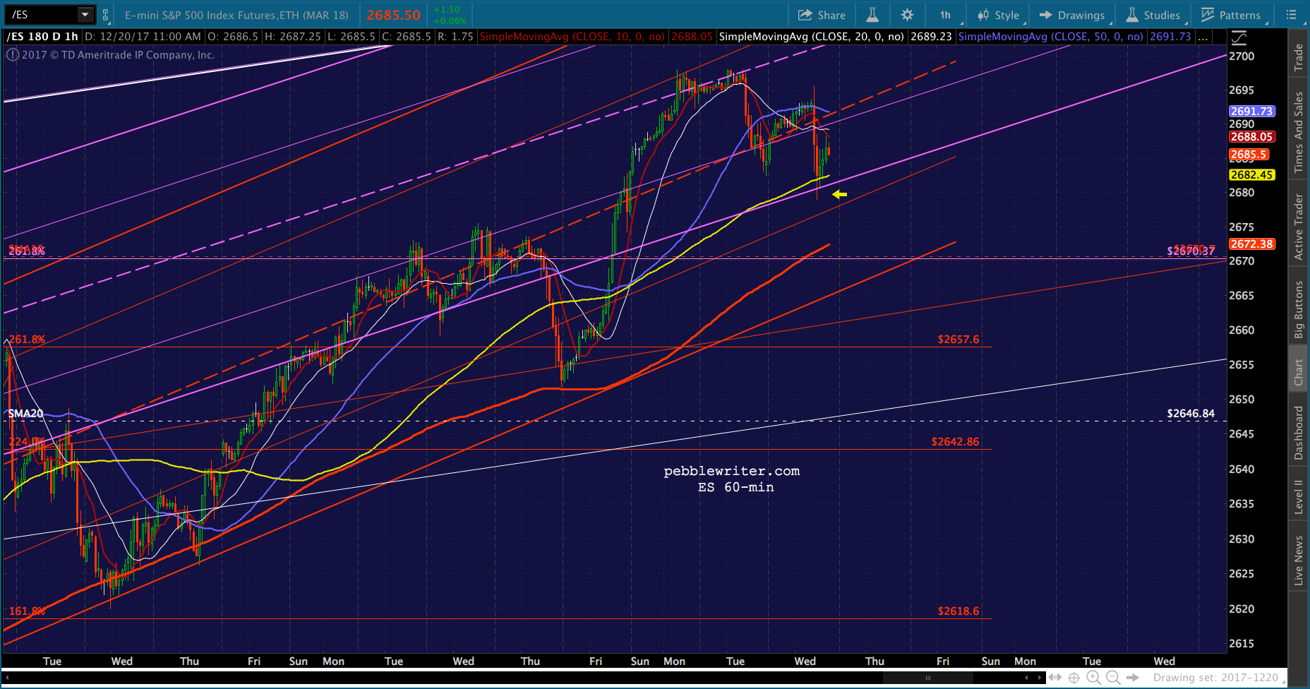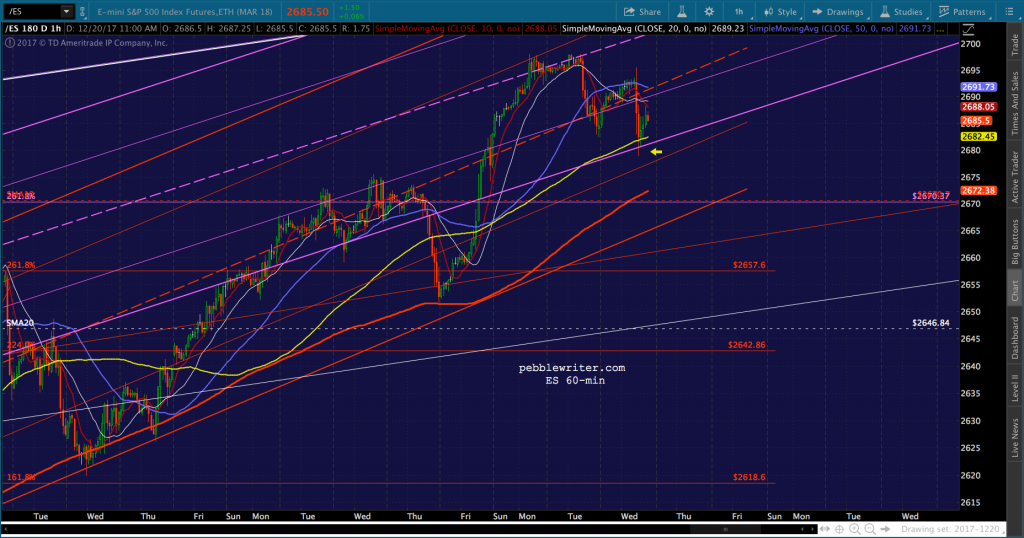 Here’s one reason: ES is having one hell of a time holding on to the rising purple channel that it reentered last Friday. It’s barely in the green, and the momentum seems to be with the bears.