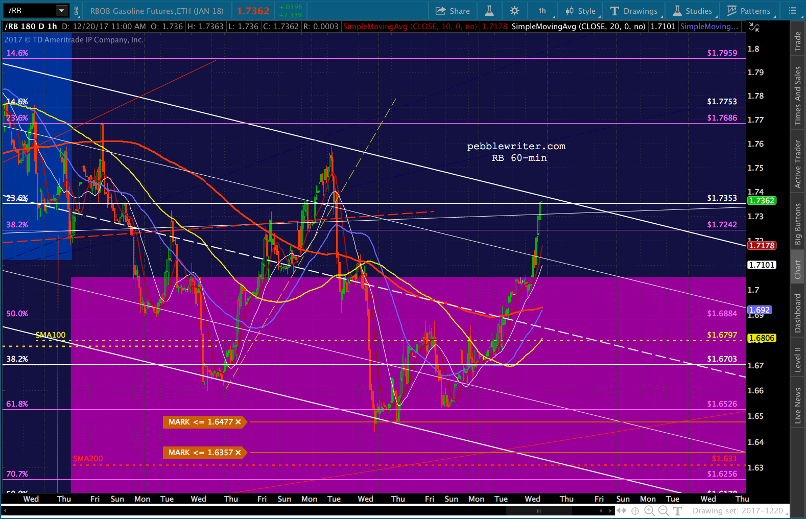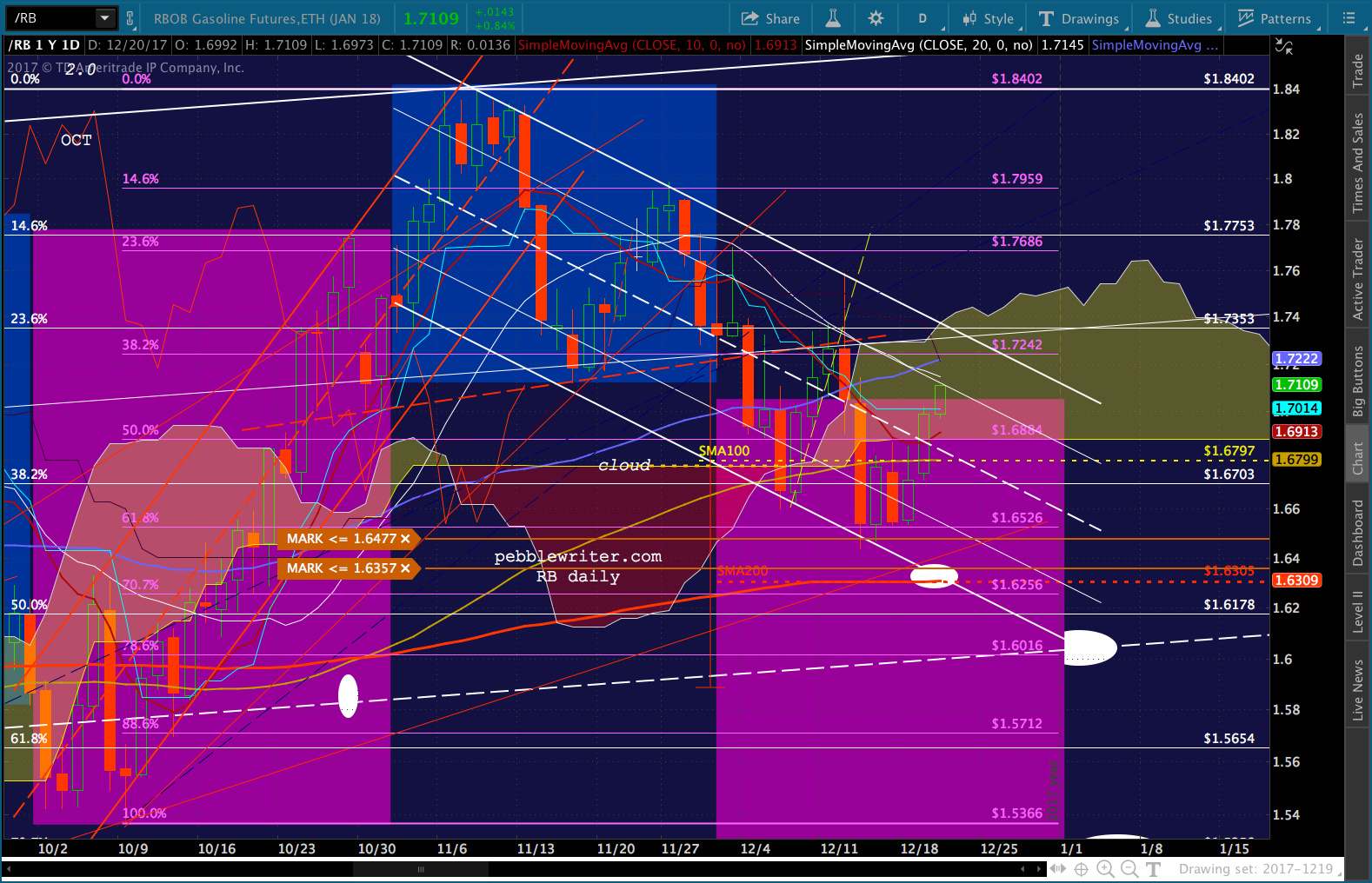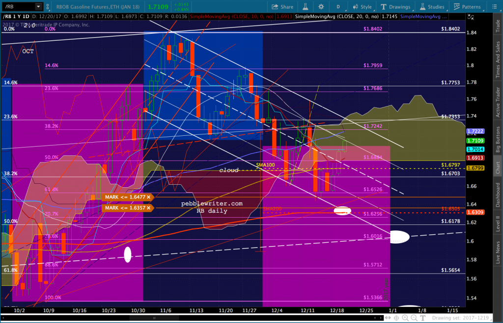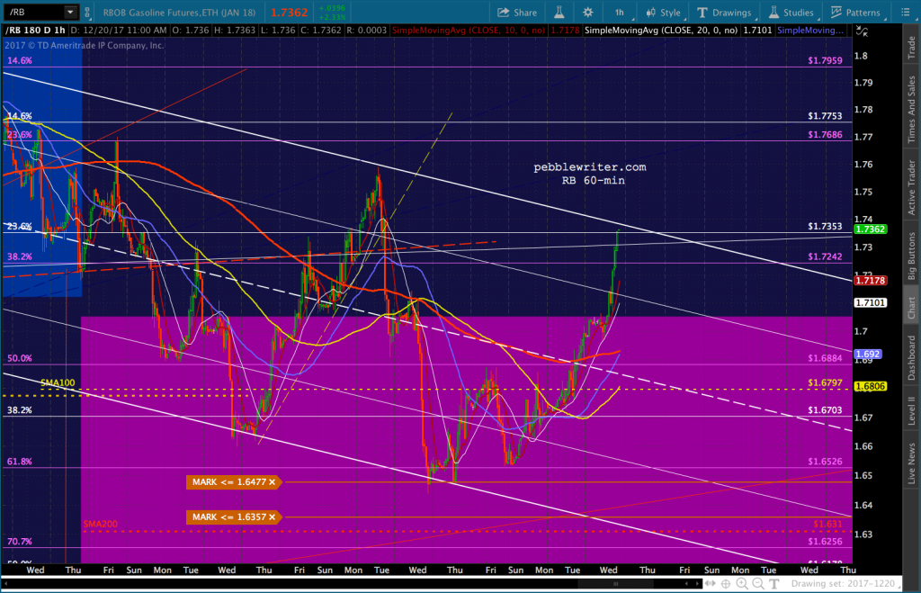 continued for members…RB has pushed into the cloud, trashing the downside case. Though, for those willing to ride it out, I believe we’ll still see lower prices in the days ahead — with 1.6305 and 1.60 being the most likely targets if we see a reversal by the falling white channel top. Remember, this is EIA inventory day — and we normally see a ramp job going into the data release.