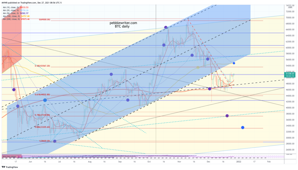 …perhaps contributing flow to BTC, which has broken above a little TL (show in red) and seen a bullish 10/20 cross. If it cross holds, it should see BTC complete its backtest at intersection of the blue channel and SMA100 at around 55,000.