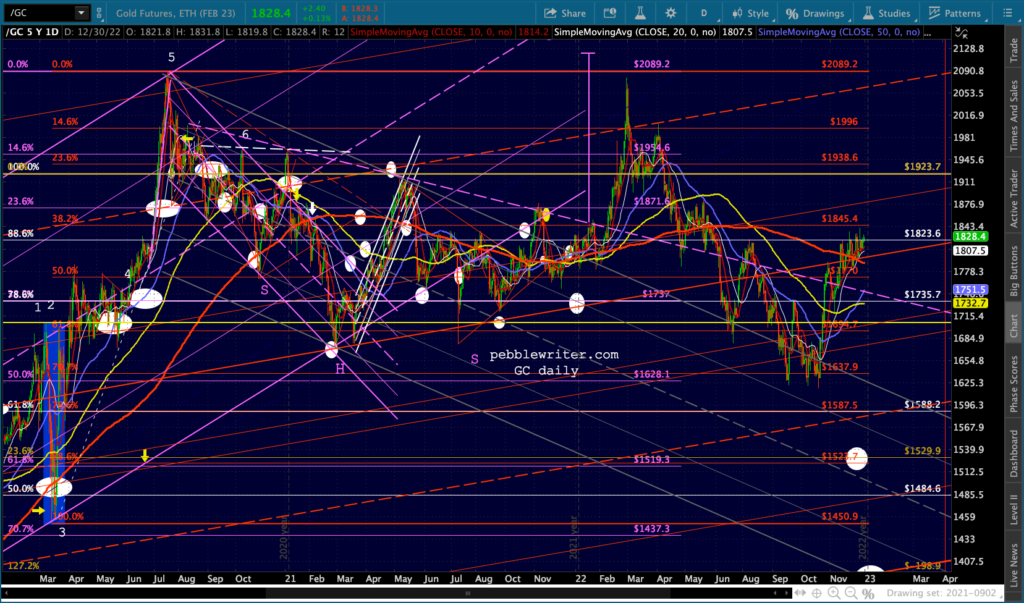 Oil and gas are on the rise this morning, with CL staying ahead of its SMA10, which just crossed the SMA20. Though it’s back in the rising white channel, the question remains whether China’s ongoing COVID debacle will take a toll on prices.