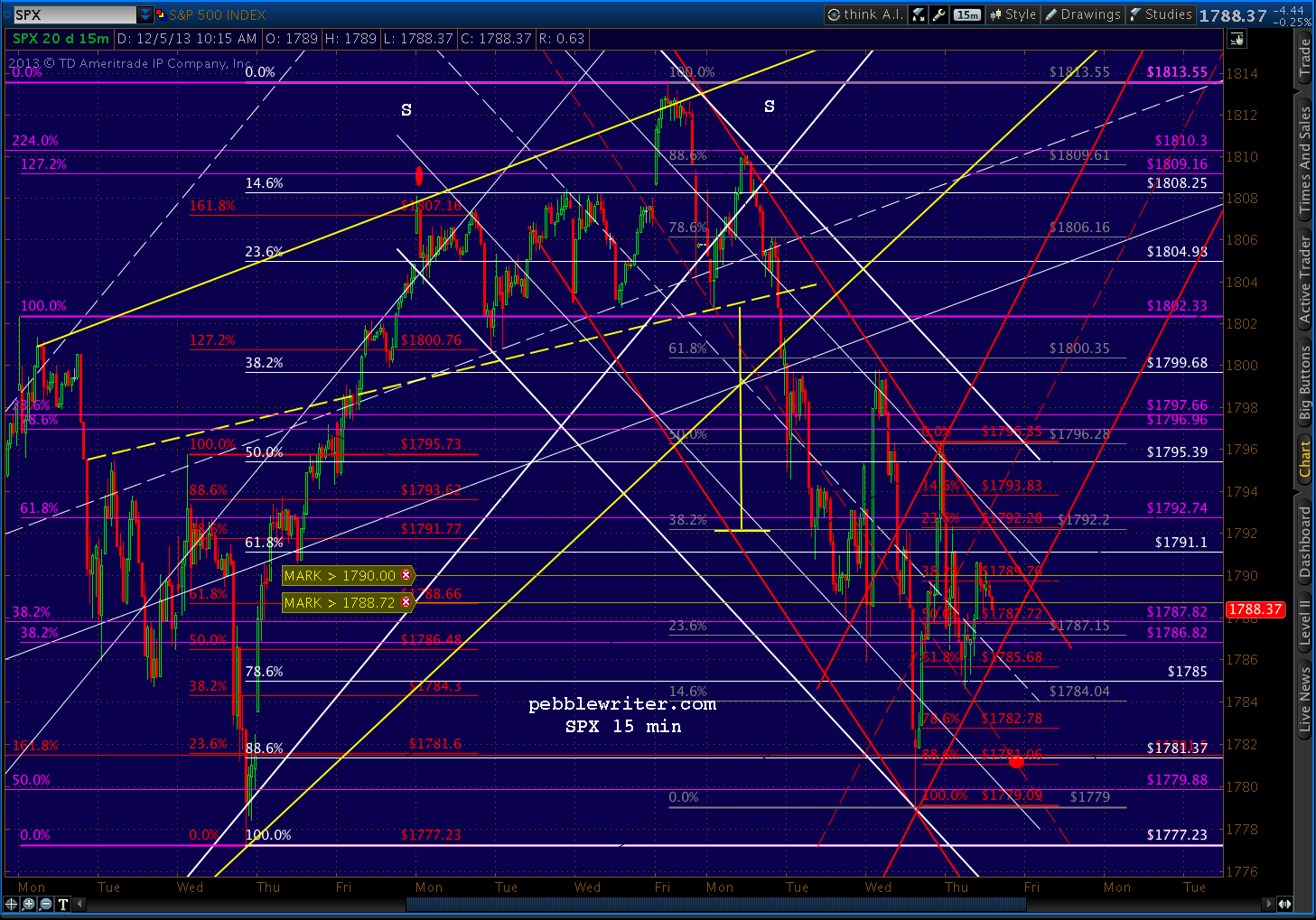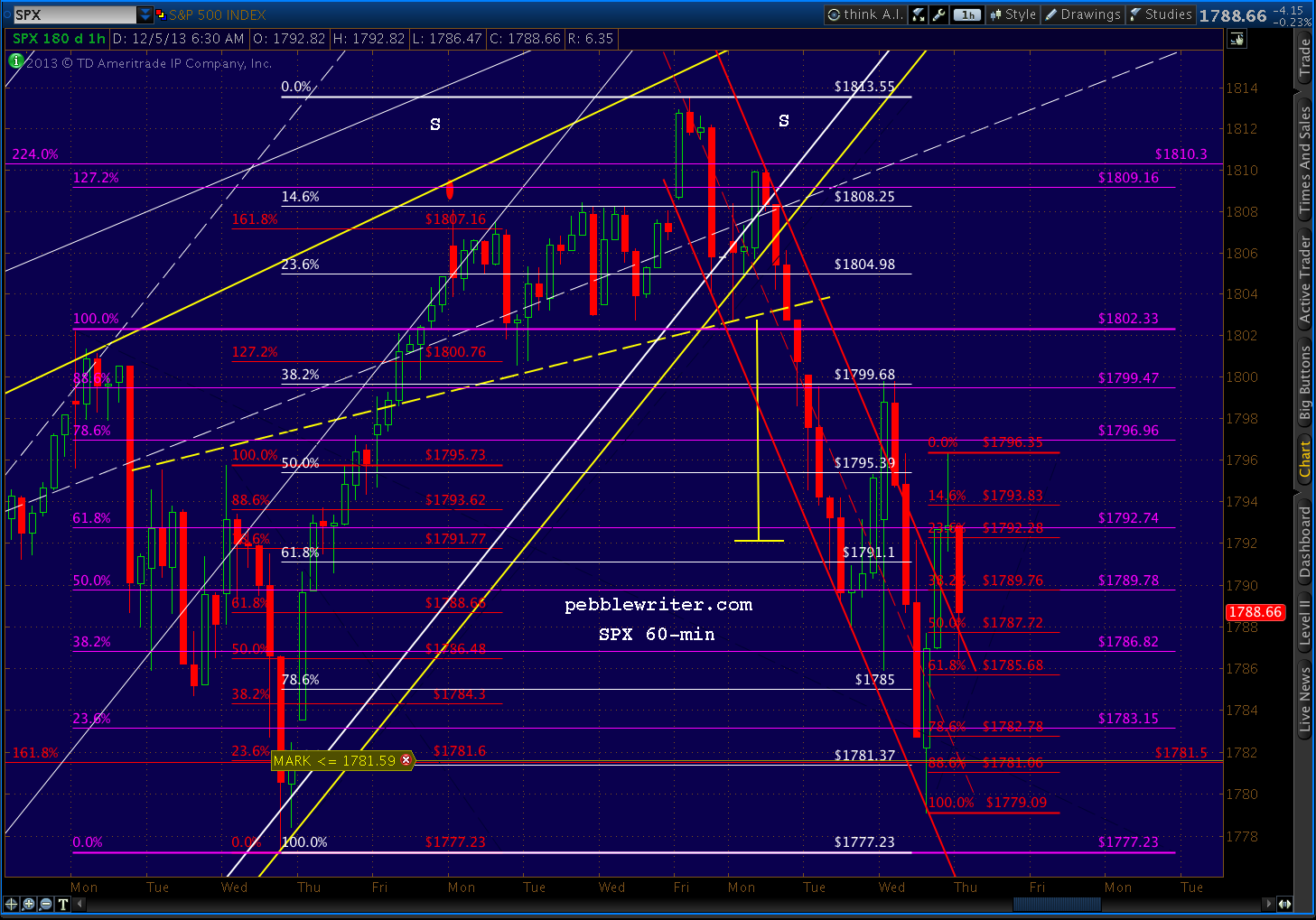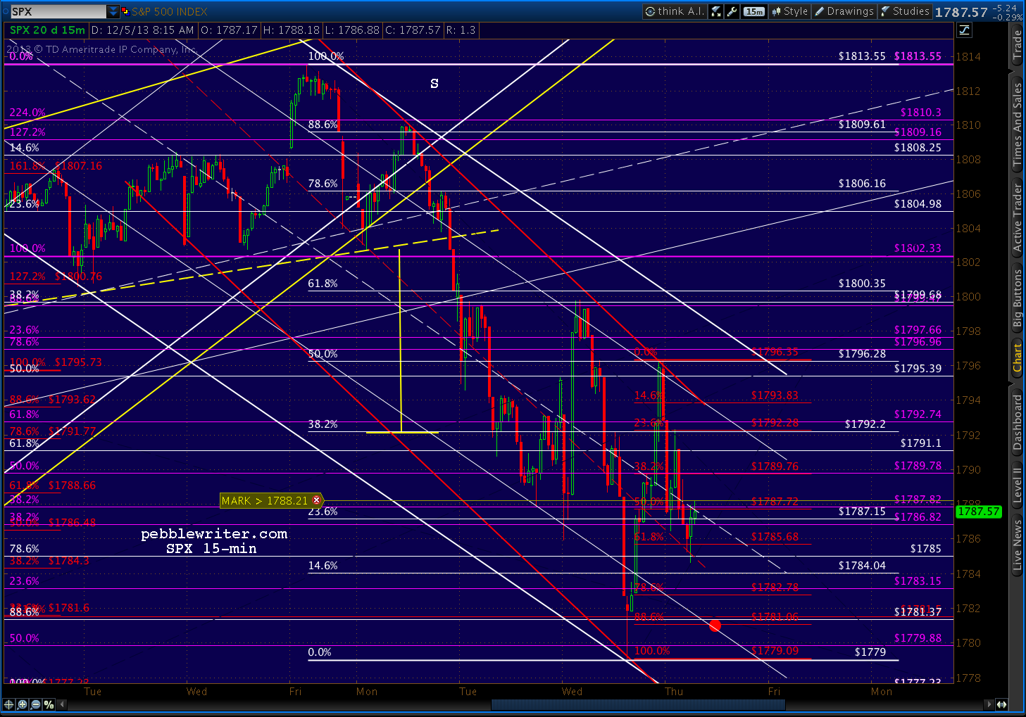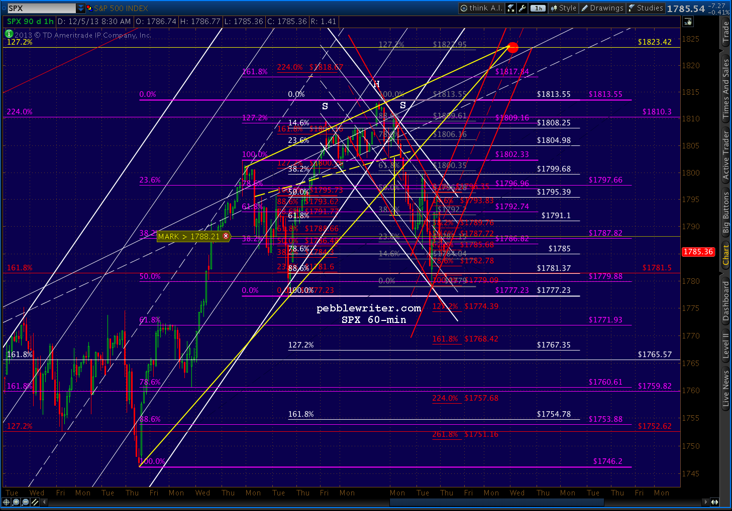 The market’s hanging in there, finding support at the purple midline and a red channel line after retracing completing a bullish Bat Pattern yesterday. The bulls need ES 1786/SPX 1785 to hold.