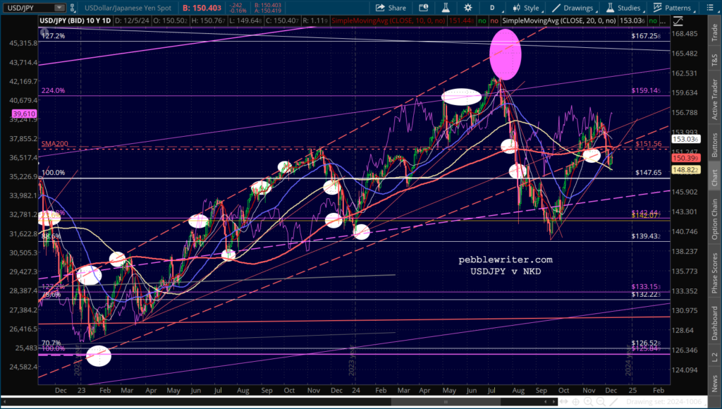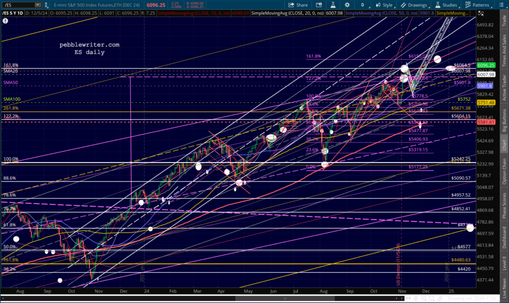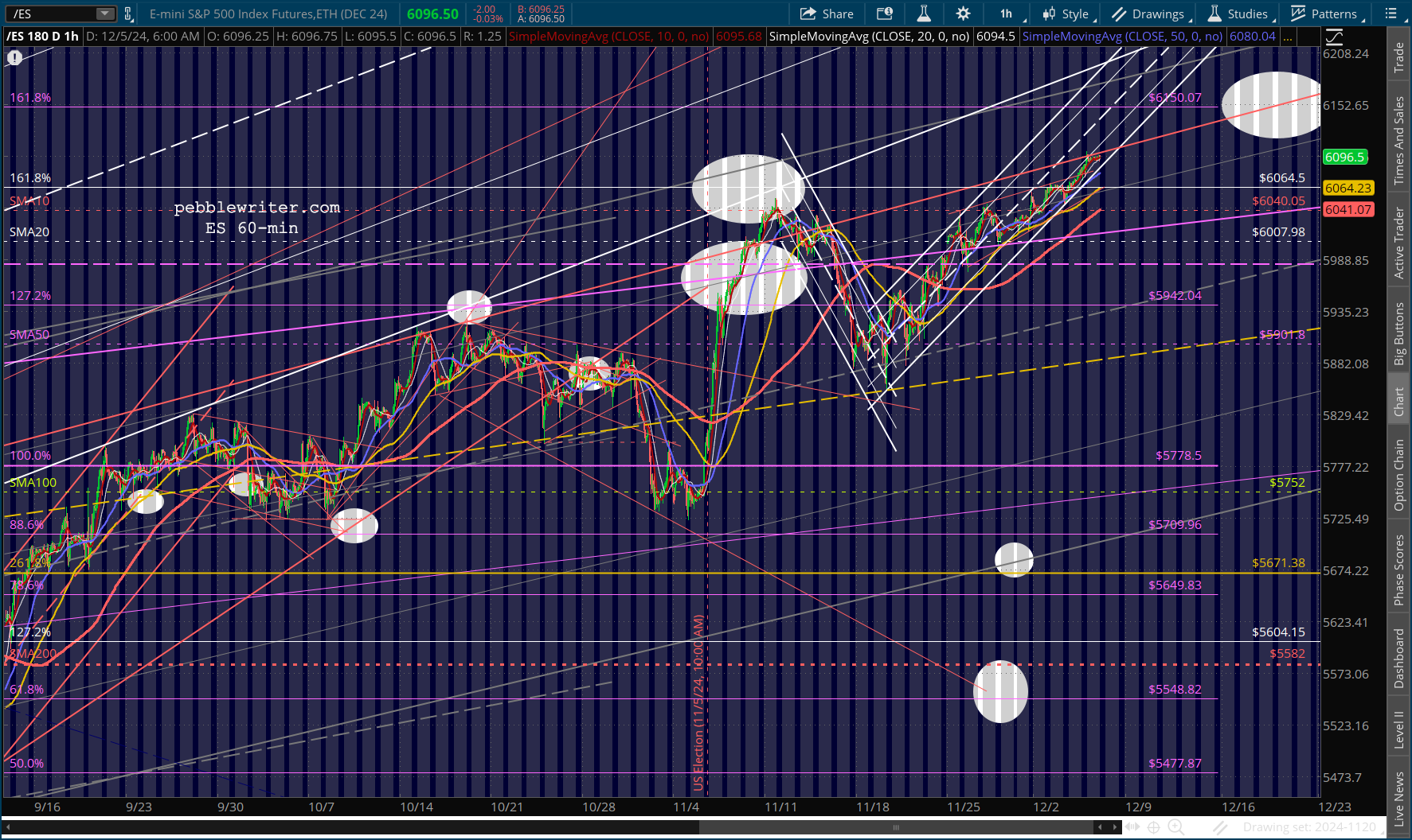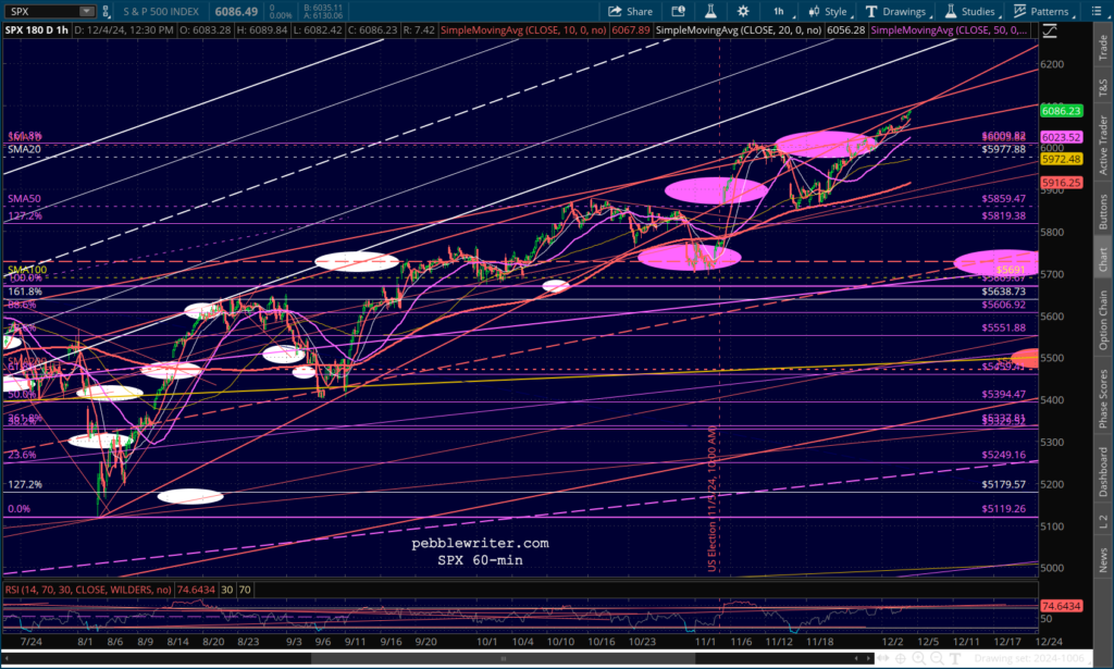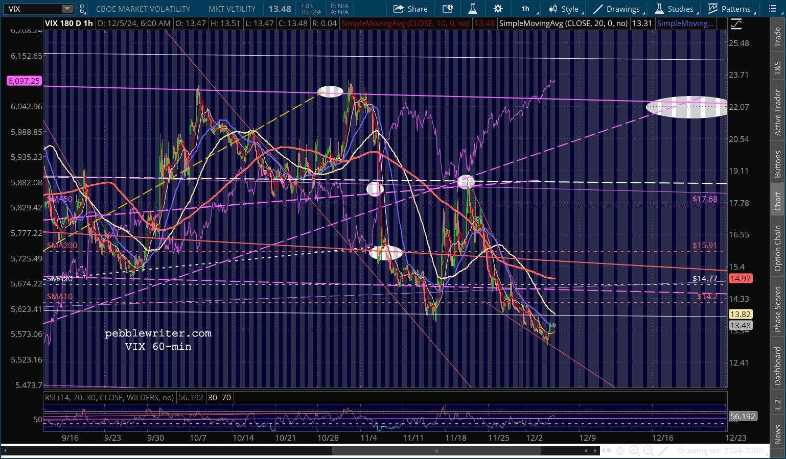 This remains a sketchy market. The lack of a significant reversal at SPX’s or ES’s important Fib extensions isn’t all that surprising given that it’s December and the typical barn race is on. But, it’s hard to justify a significant climb between now and Dec 31 unless VIX continues to melt down – and that’s a tall order given the obvious economic issues (tariffs) staring investors in the face. This feels very much like picking up pennies in front of a bulldozer.