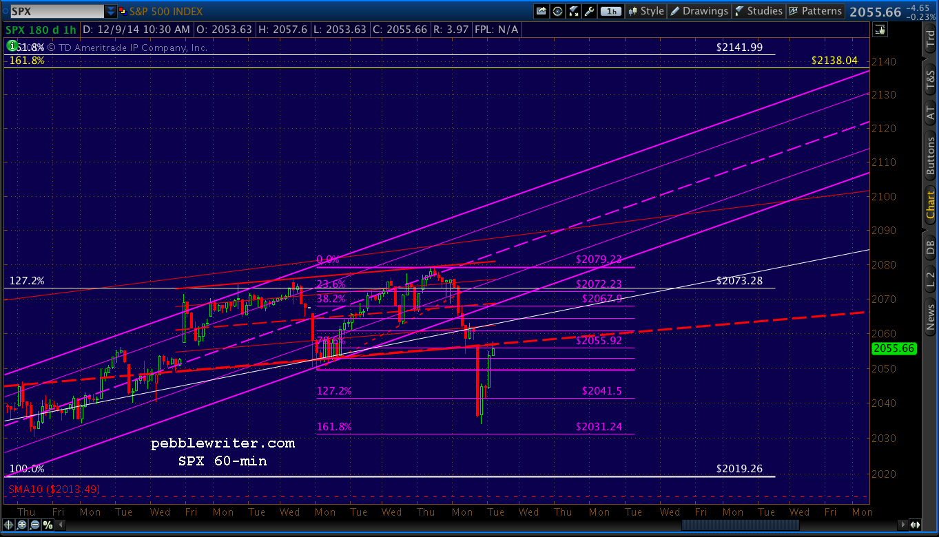 SPX dipped slightly lower than our 2055 target yesterday, reversing at 2054.27 before a lackluster bounce that reached 2063 before petering out. From the Dec 5 Update: