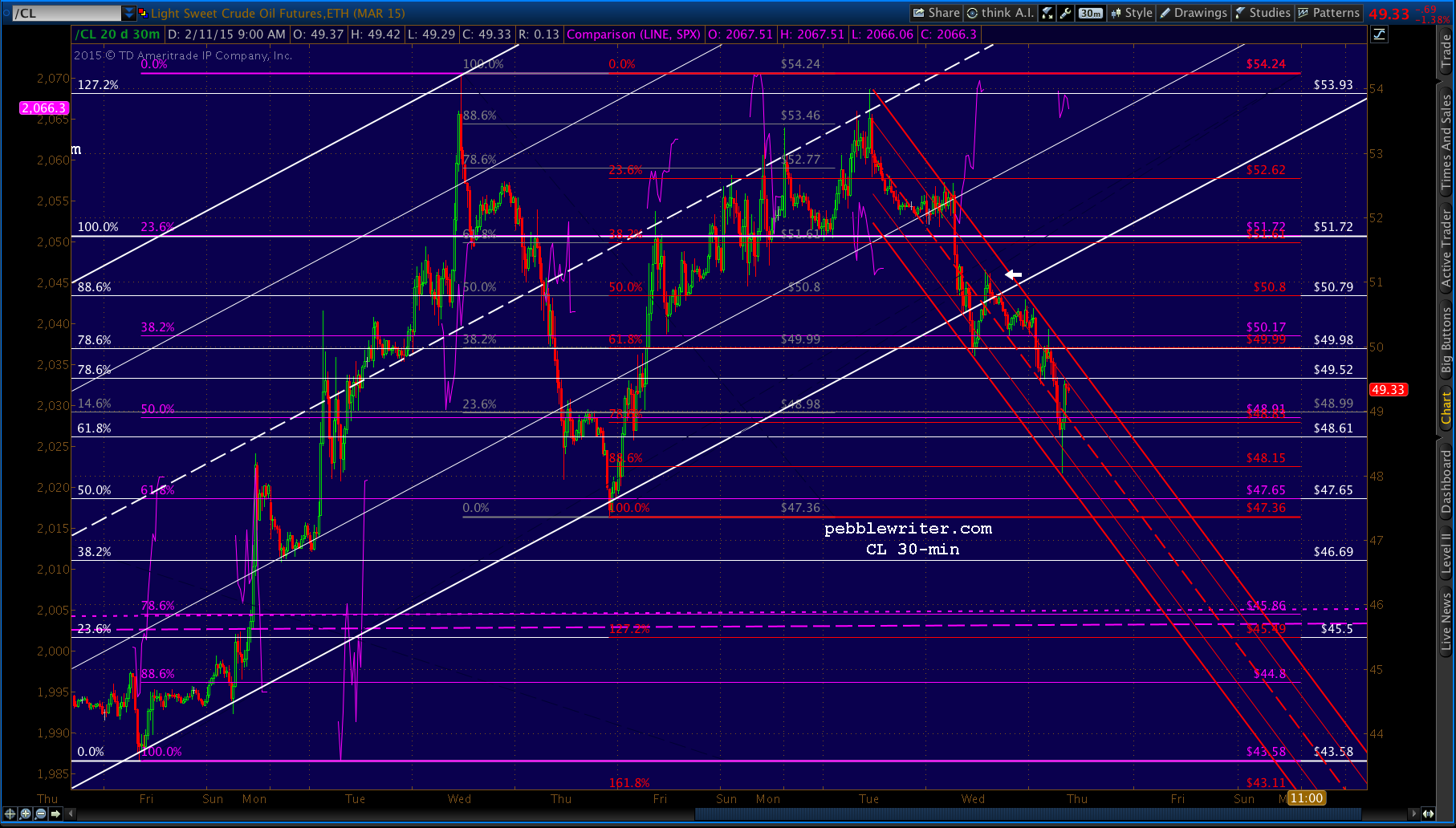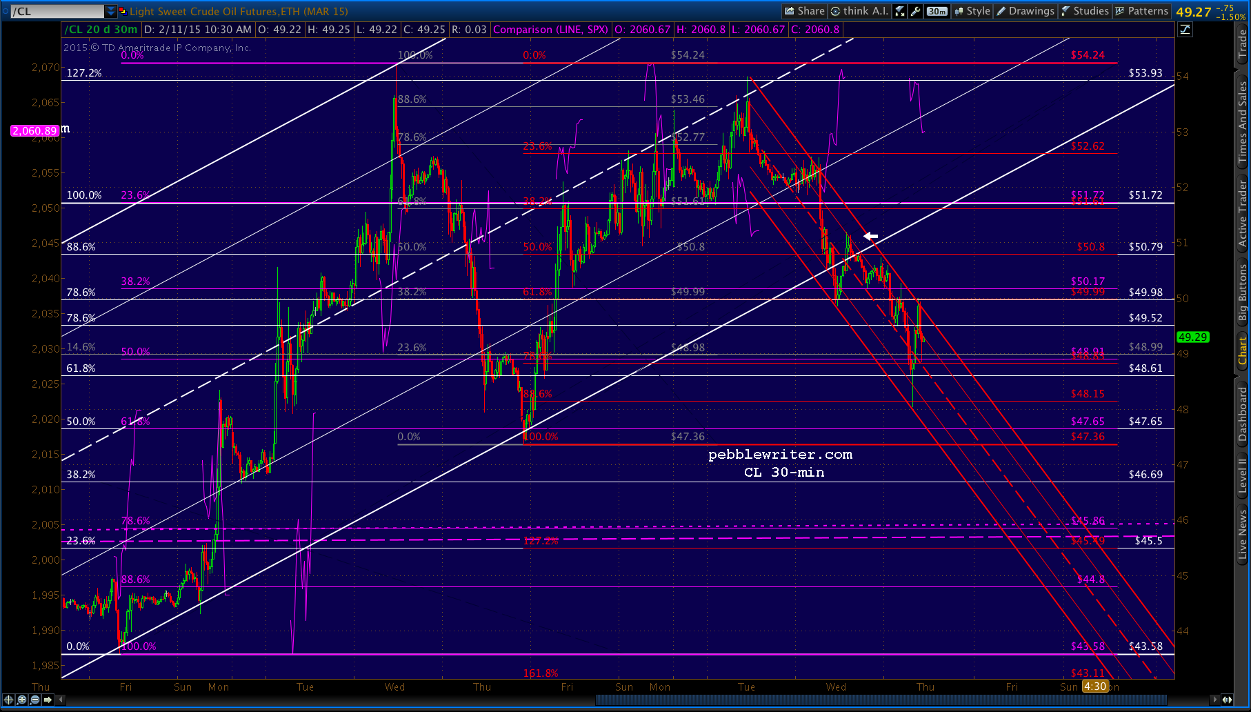 It would help a lot if CL could put in a strong backtest of the rising white channel, or at least break out of the falling red channel. Note the reversal at the red .886 Fib.