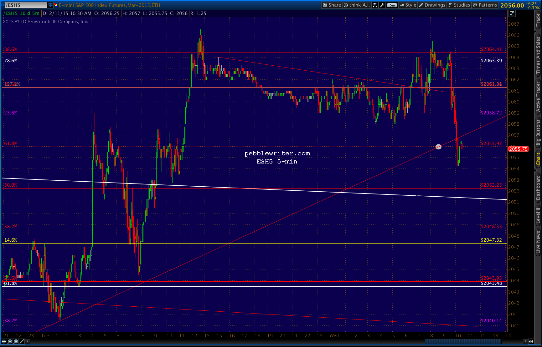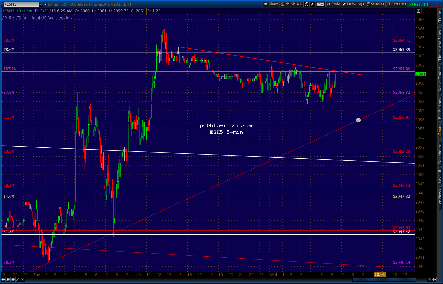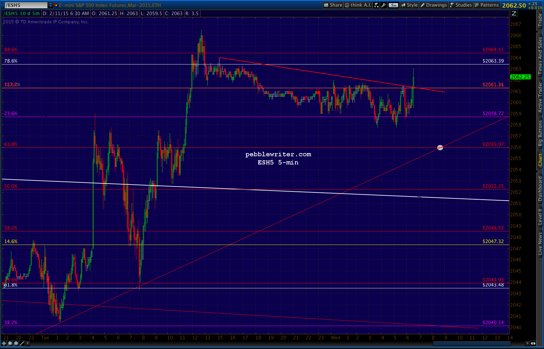 The futures are off only a few points, and seem poised to take SPX higher after a night of sideways action. Perhaps tag the 2055.97 at the rising TL and then a ramp job? Or, maybe just a pop through the resistance…