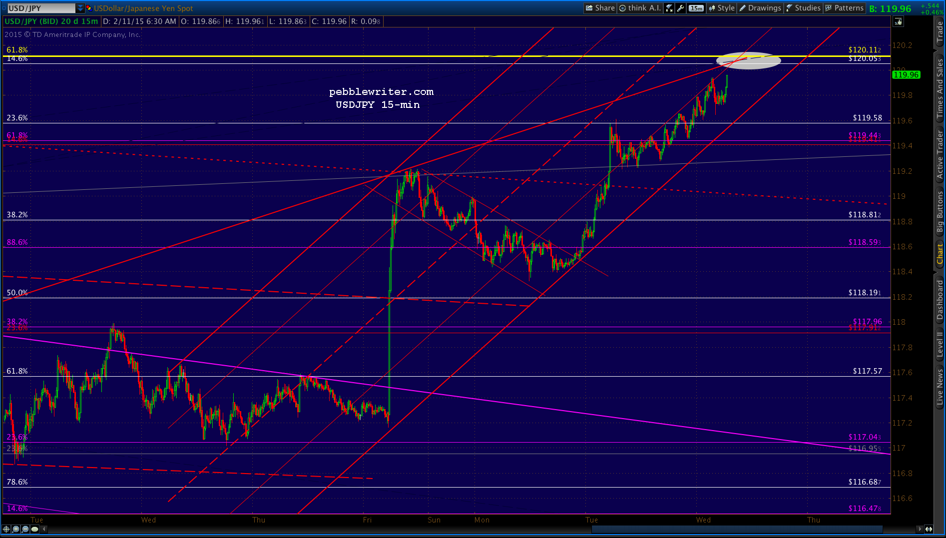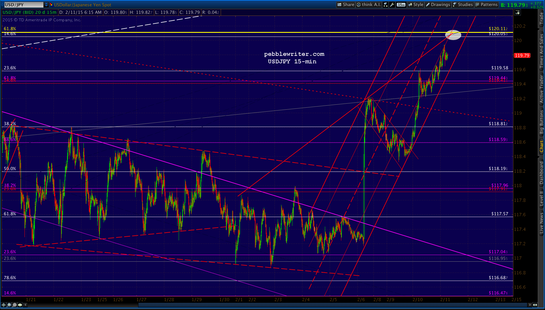 And, USDJPY is attempting a backtest of the broken yellow .618. My best guess here is sideways through the cash close, and then a drop overnight to 119.75, followed by a pop up through 120.82.