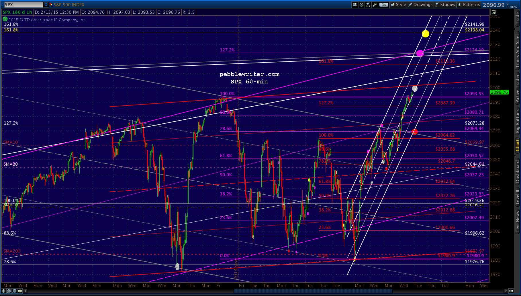 Our 2138 target is easily within our grasp, now. The white acceleration channel reaches it as soon as Thursday — assuming no big backtests or retracements. But, that’s a big assumption. The past six weeks have been full of both.