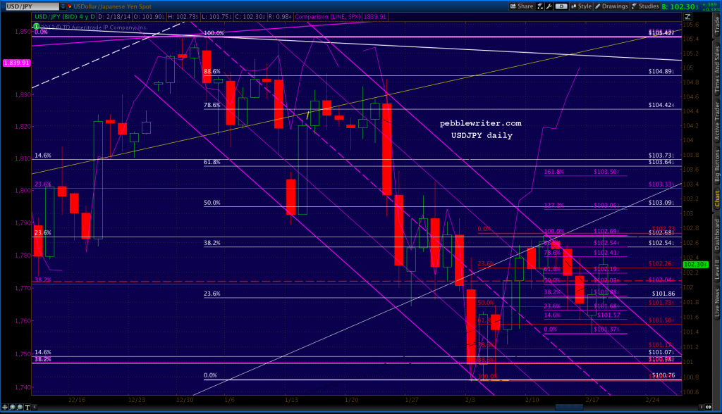 The USDJPY is helping to boost stocks, but is in danger of fading back into the falling purple channel. Though SPX has retraced .886 of its 2014 losses, the USDJPY itself has barely topped .382.