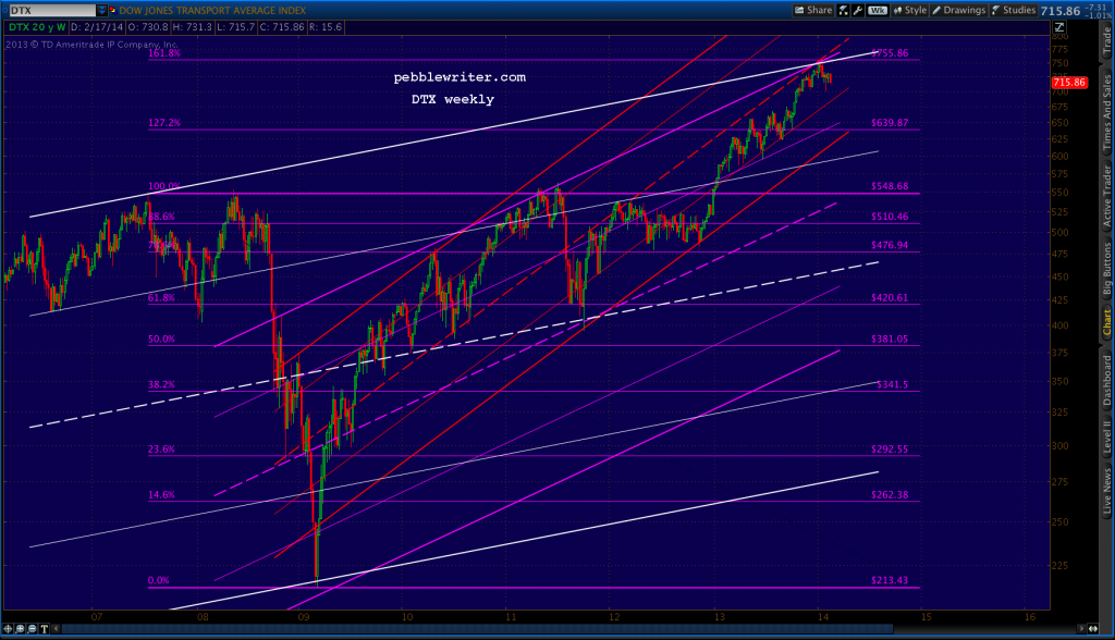 Just took a fresh look at the transports… Immediate support at 696.50 (an 8.25% decline from the top.) If that doesn’t hold, no support until 639.87 — a 15% decline (equivalent of 1573 on SPX…the 2007 high.)
