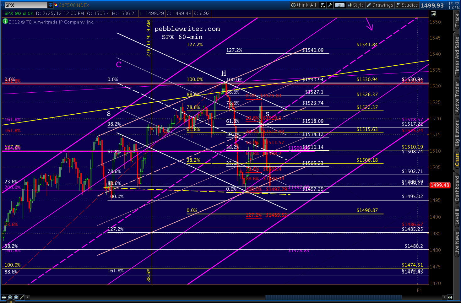 Recall that we shorted at 1530.50 on Feb 19 (the 2:45 update) and went long for a bounce at 1499 on Feb 21 (10:20 update.)