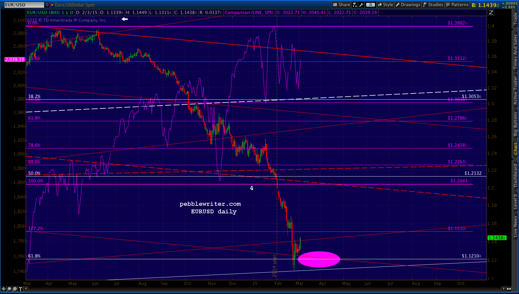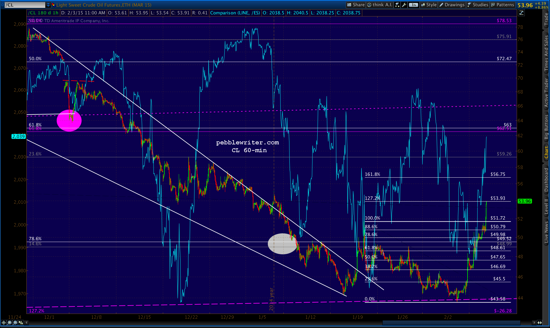 …but oil sure did — popping through the Jan 15 high. I see no chart patterns or Fib levels that should prove problematic except on the small white grid — the 1.272 and/or 1.618, for instance.