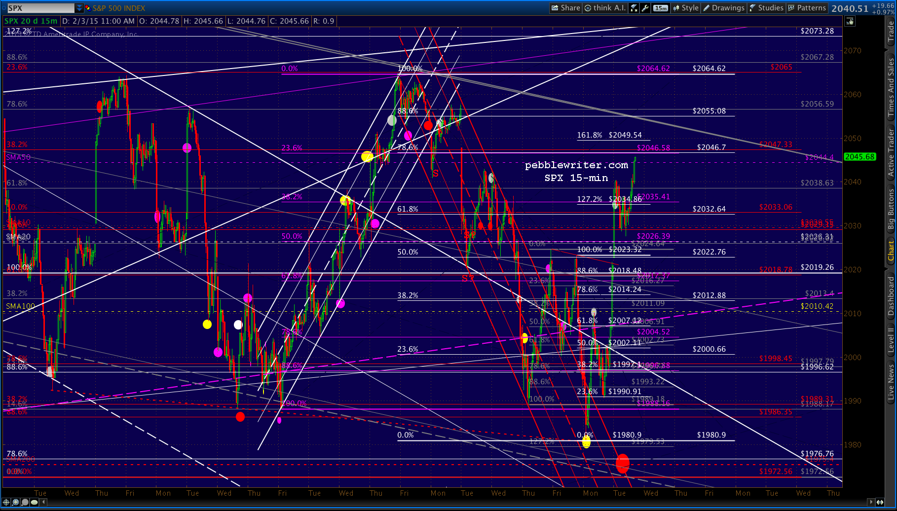It’s taken SPX through the 1.272 Fib to test the SMA50. I expect a reversal here at 2045, but the white .886 is certainly a possibility — especially if the gray channel is a reality.