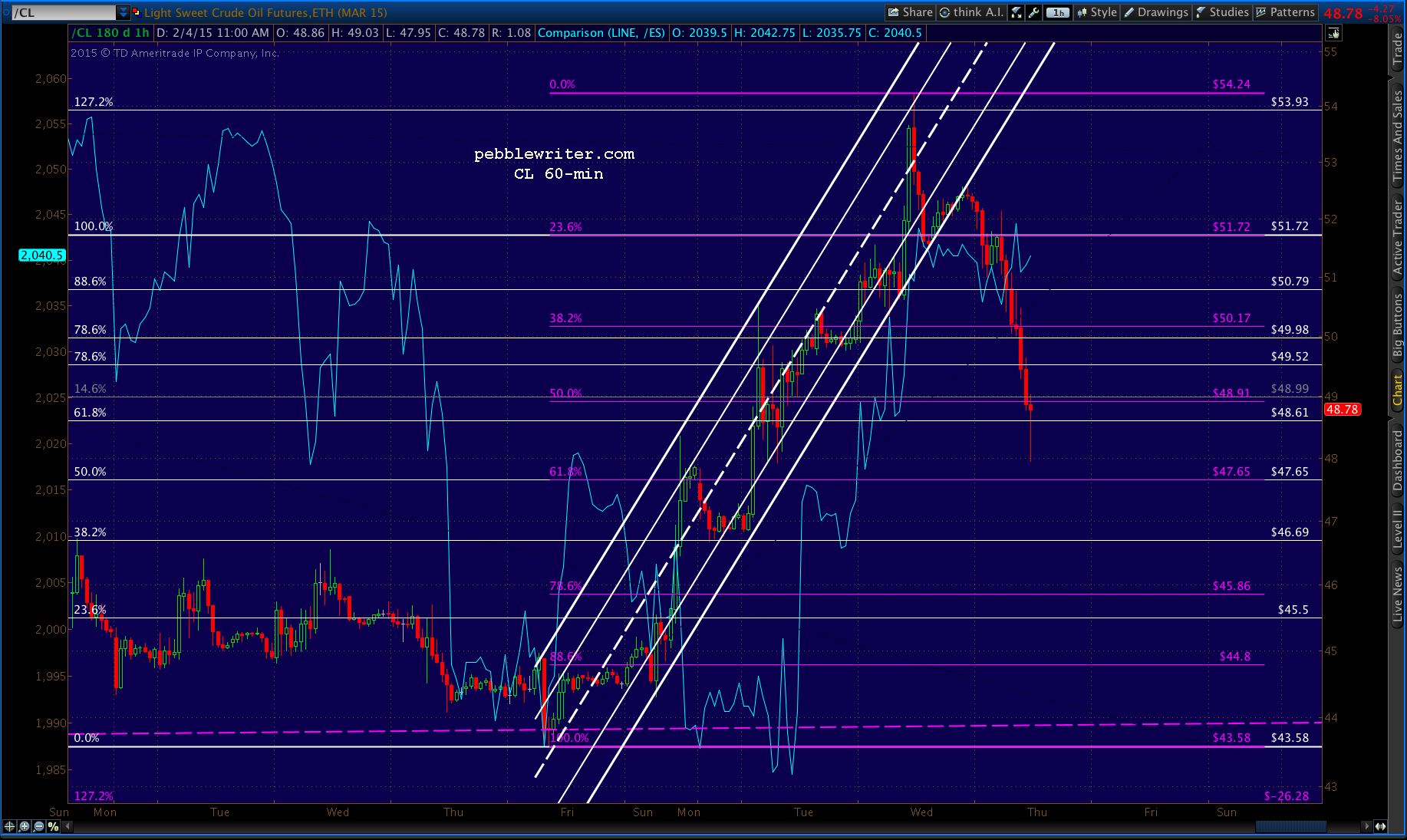 CL is bottoming at the white .786 at 49.98.