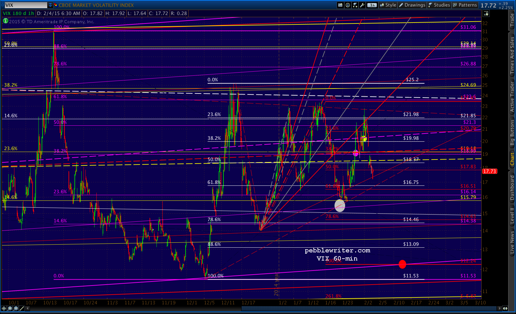 Another interesting chart is VIX, which got a bounce off a lower fan line yesterday. While I think it’ll eventually test that red, dashed TL off the recent lows, it appears to have a bounce left beforehand.