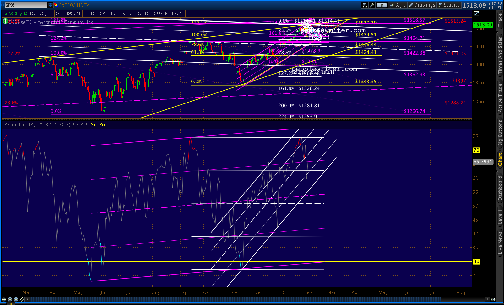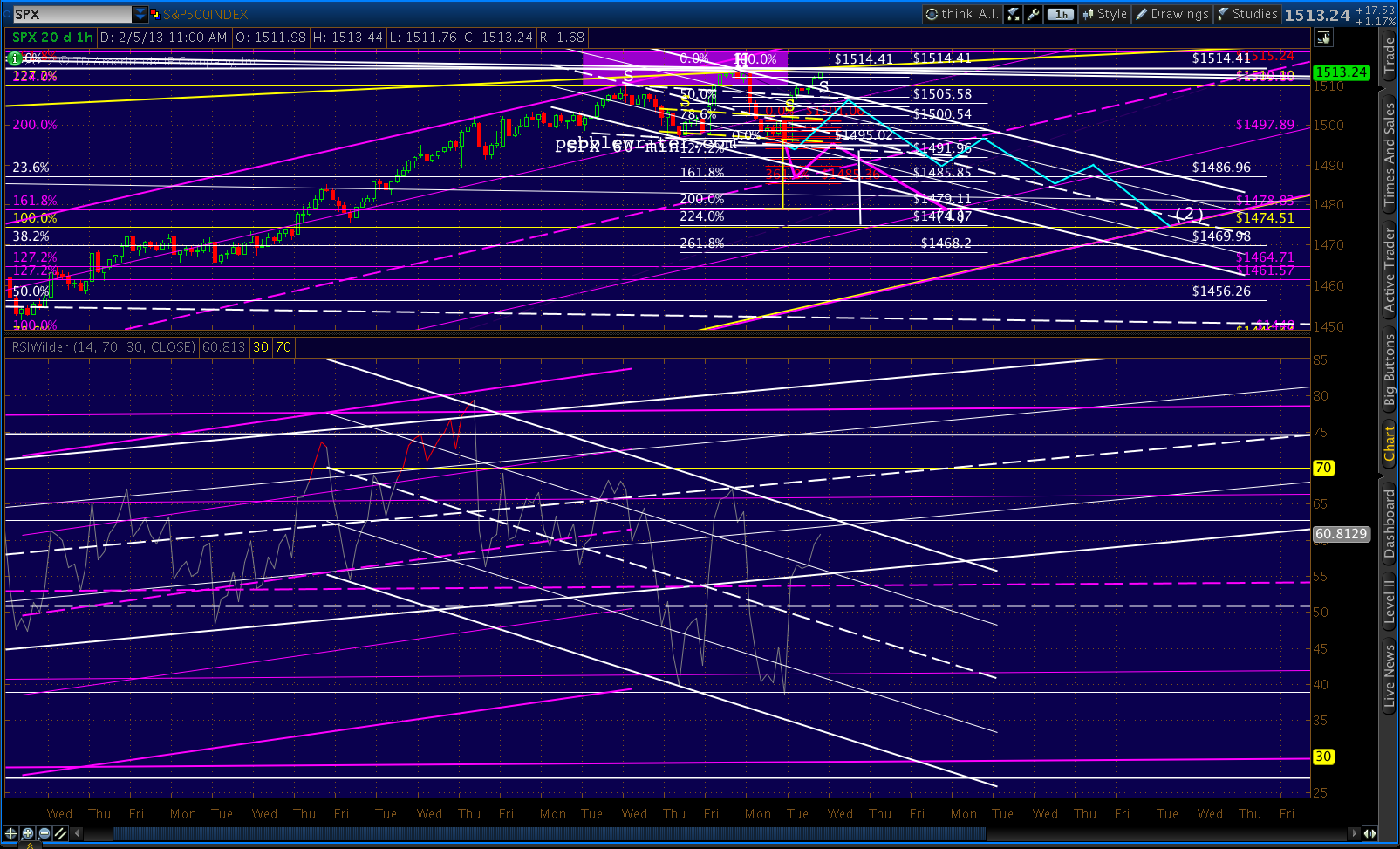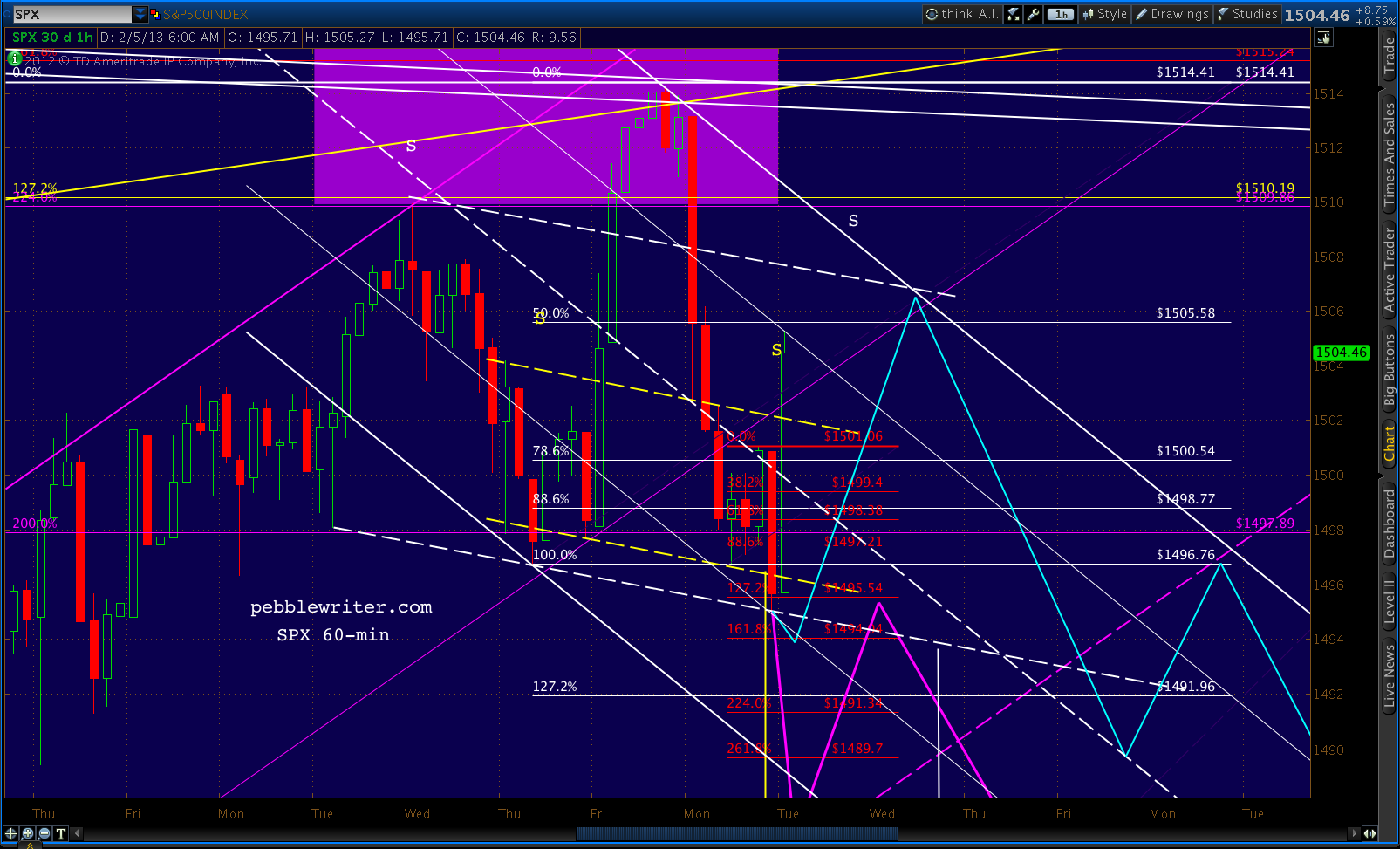 I was premature in closing out my intra-day long position, as SPX just tagged the proposed channel upper bound near the .786 at 1510.26. This had been on my original target list, but I thought the PMI miss would have more of an impact. We’ll see if this Fib holds.