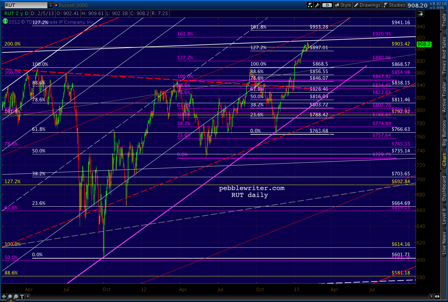 Note that we’re sneaking up on the RUT’s two 1.618 Fib levels and a 1.272 Fib at 920.95, 933.28 and 941.16 (though the large white pattern’s 1.618 at 1033 is also a strong contender should the SPX and RUT diverge.)