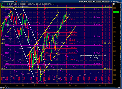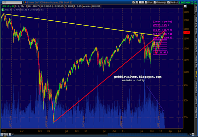 The rising wedge formed with the fan line from Mar 09 is obvious (though I never thought it would grow to include the Oct 27 aberration.) It also has a lot of open space near its upper bound, making it look a bit hinky.