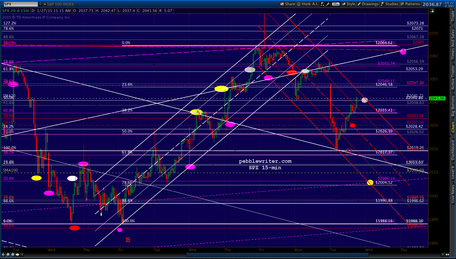 If it can’t push through the SMA10 (60:40?), then the white .618 at 2017.37 is still in play, and the SMA100 is waiting down at 2010ish. Note that with a reversal very close to the .618, we could see a Gartley Pattern target the .786 at 2004.52 — which would make for a nice head fake on the downside.