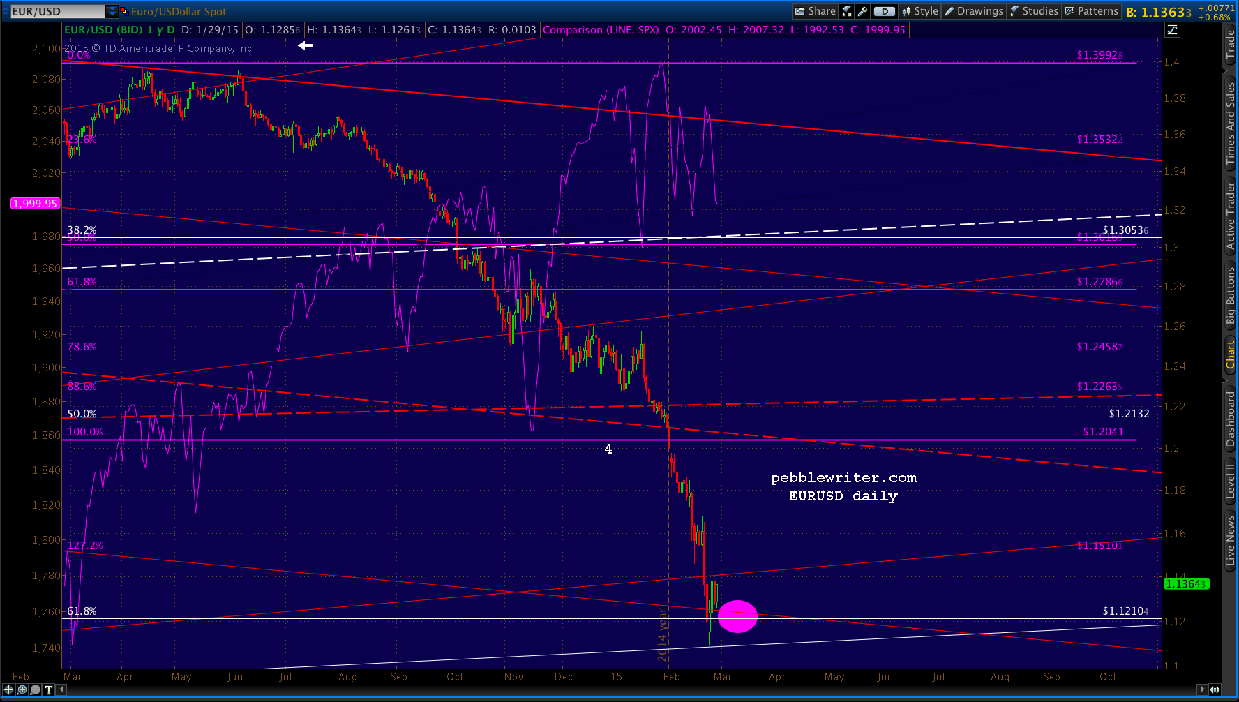 TPTB were clearly hoping for EURUSD to pick up the carry trade where USDJPY left off, but the pair had already made its move. It bottomed at our 1.12 target on Jan 23 and has since bounced higher.