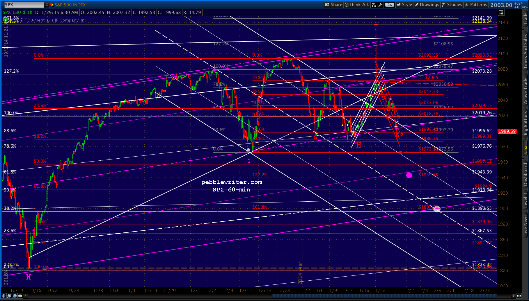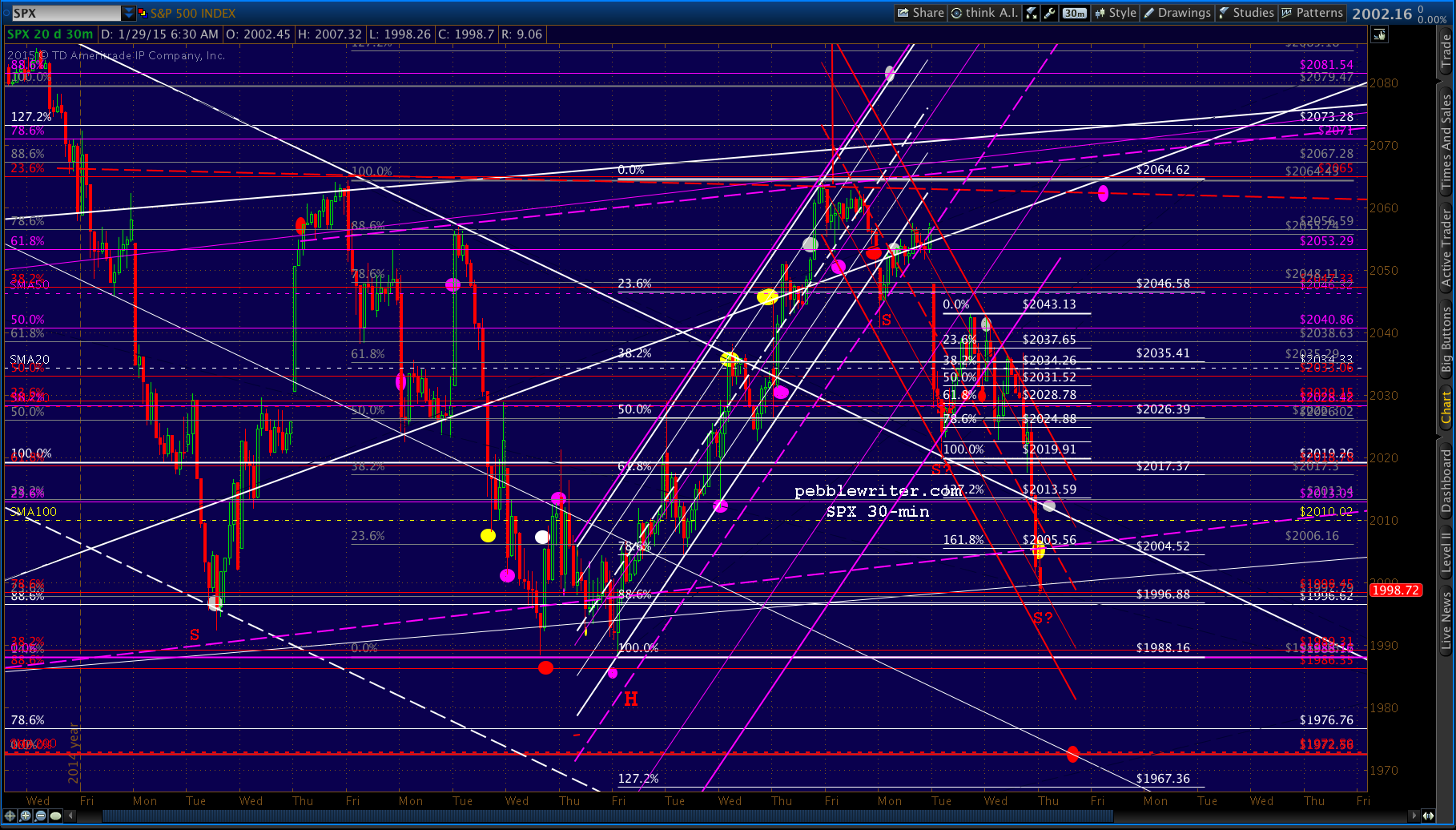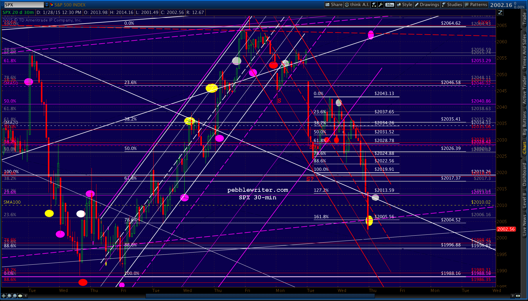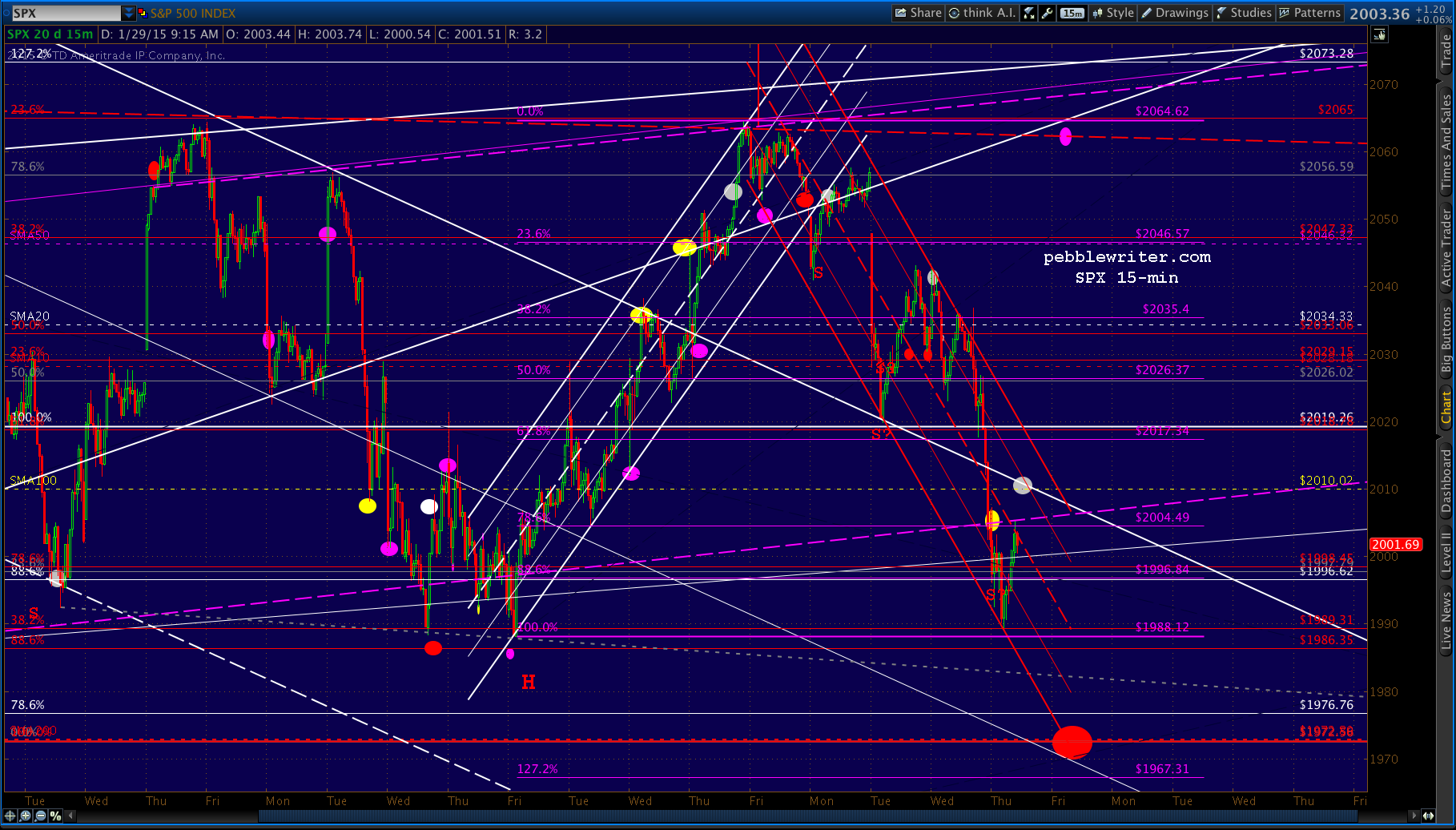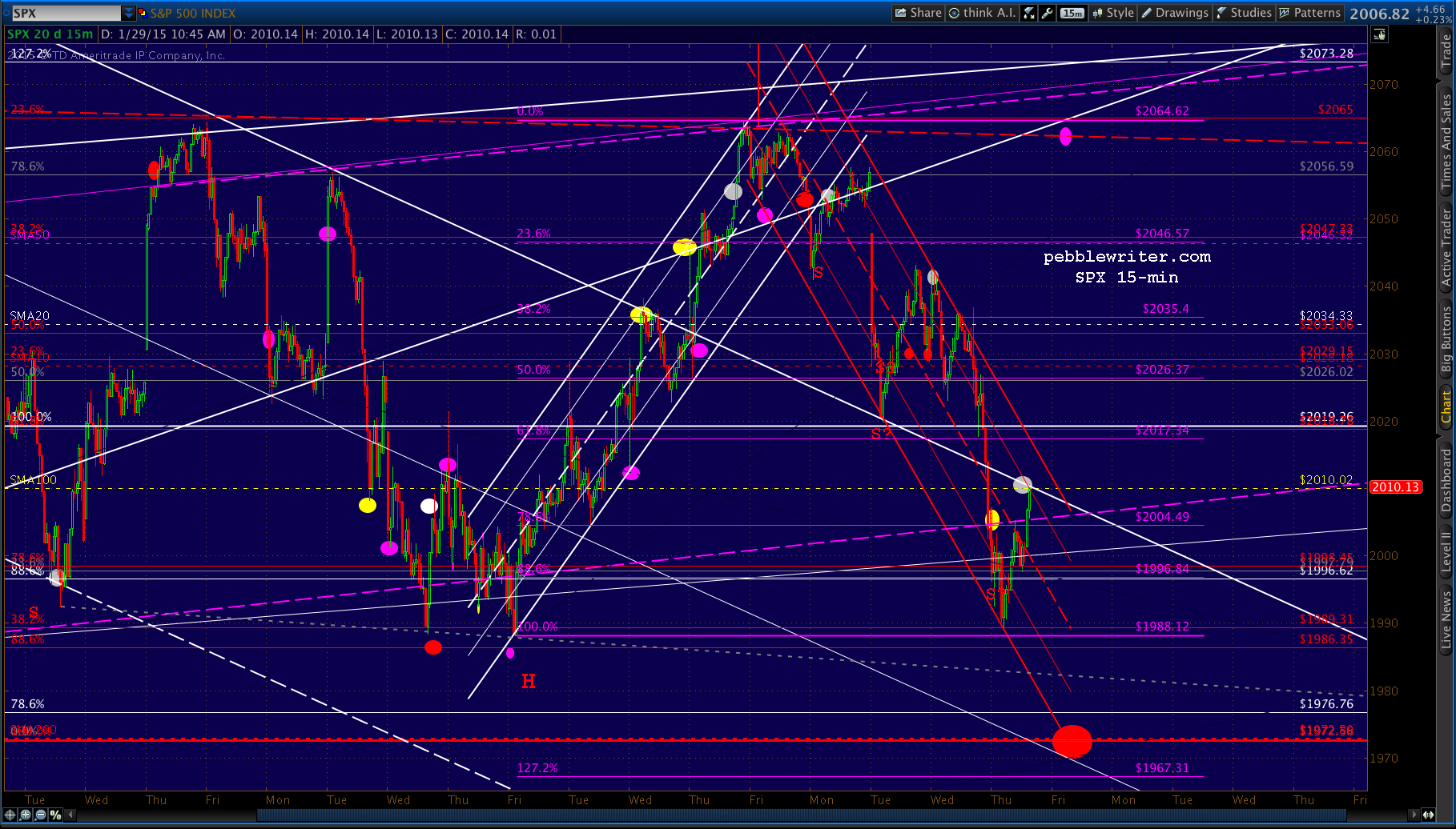 We called for a rebound at 2004, as it completes a Gartley Pattern (the white .786) as well as a Crab Pattern (the smaller, white 1.618.) and — yet, again — tests the SMA100 and a key channel midline.