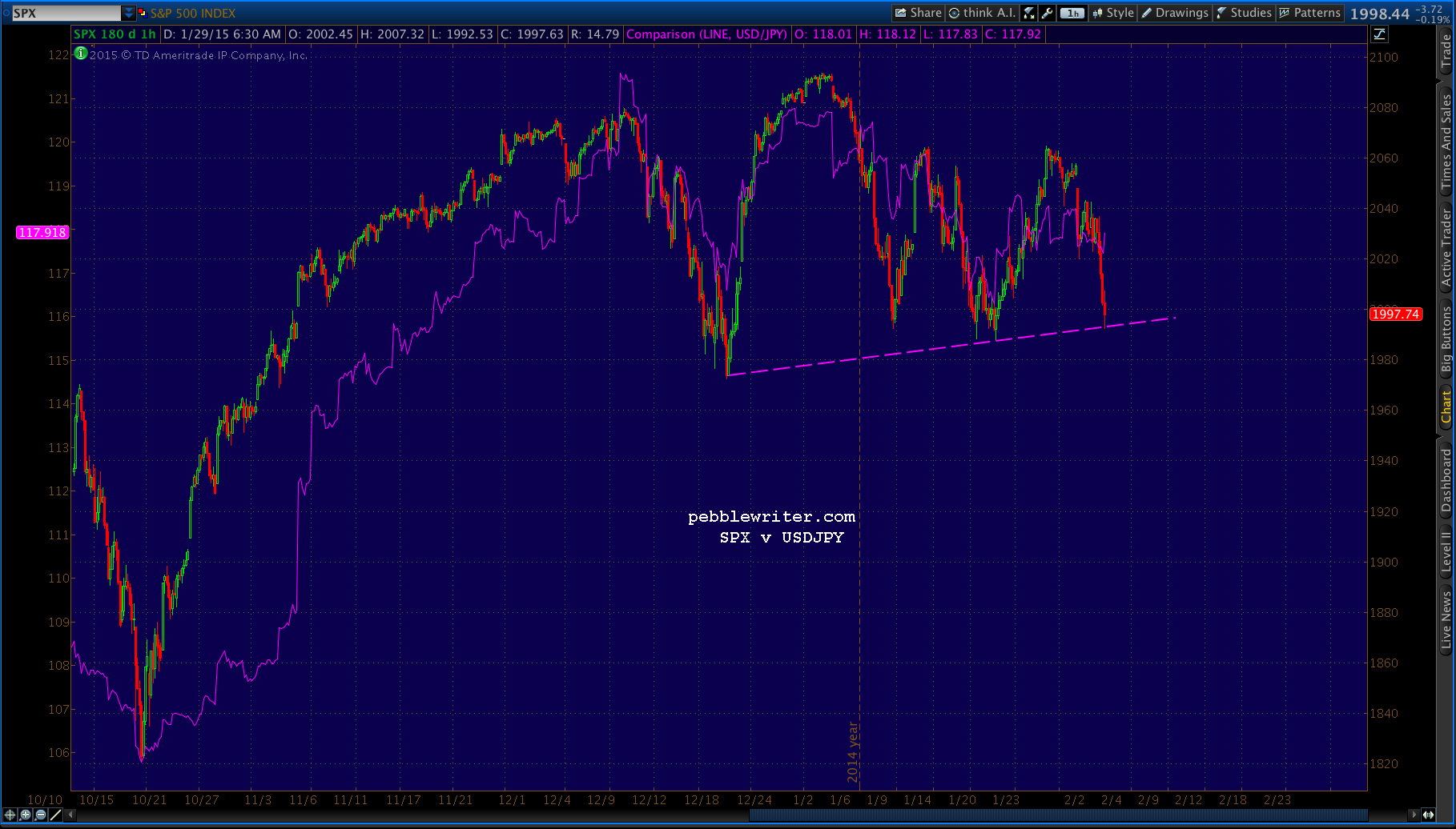 SPX just reached the white channel top. USDJPY is getting close, but hasn’t quite reached the triangle upper bound, so I wouldn’t be surprised to see SPX overshoot a little bit.