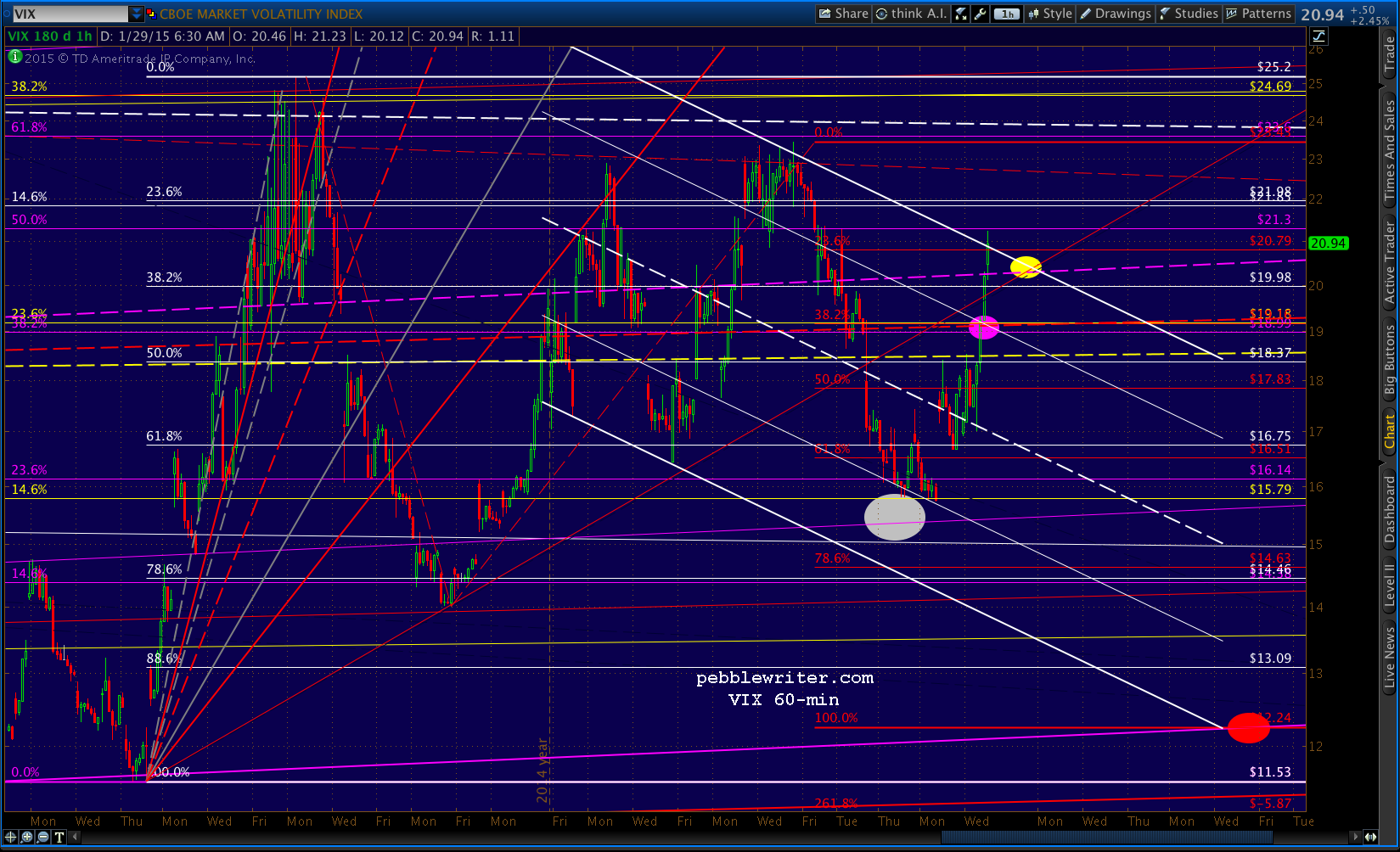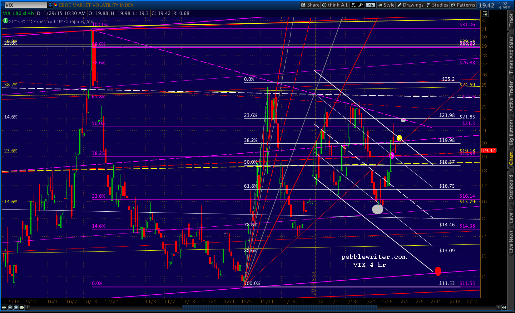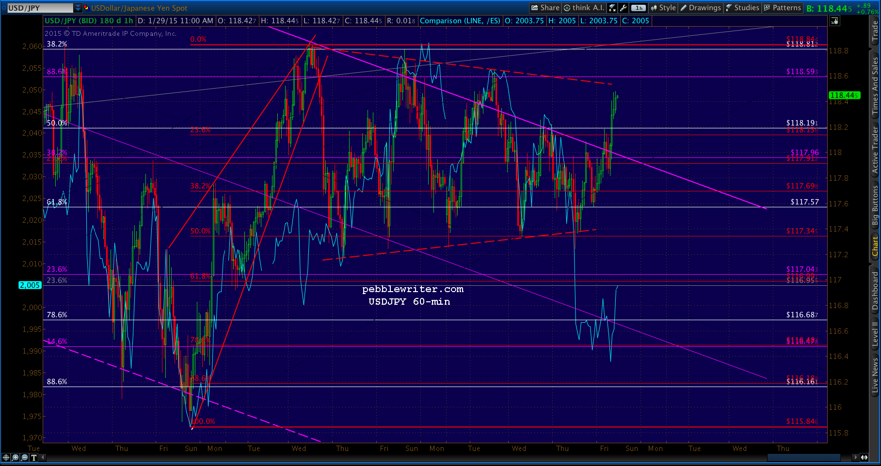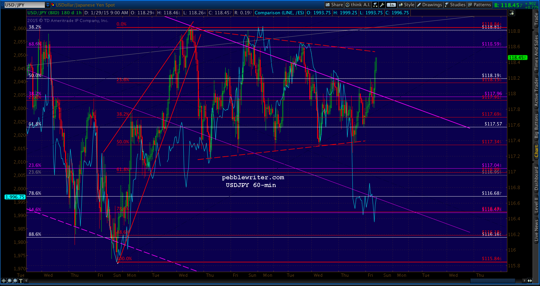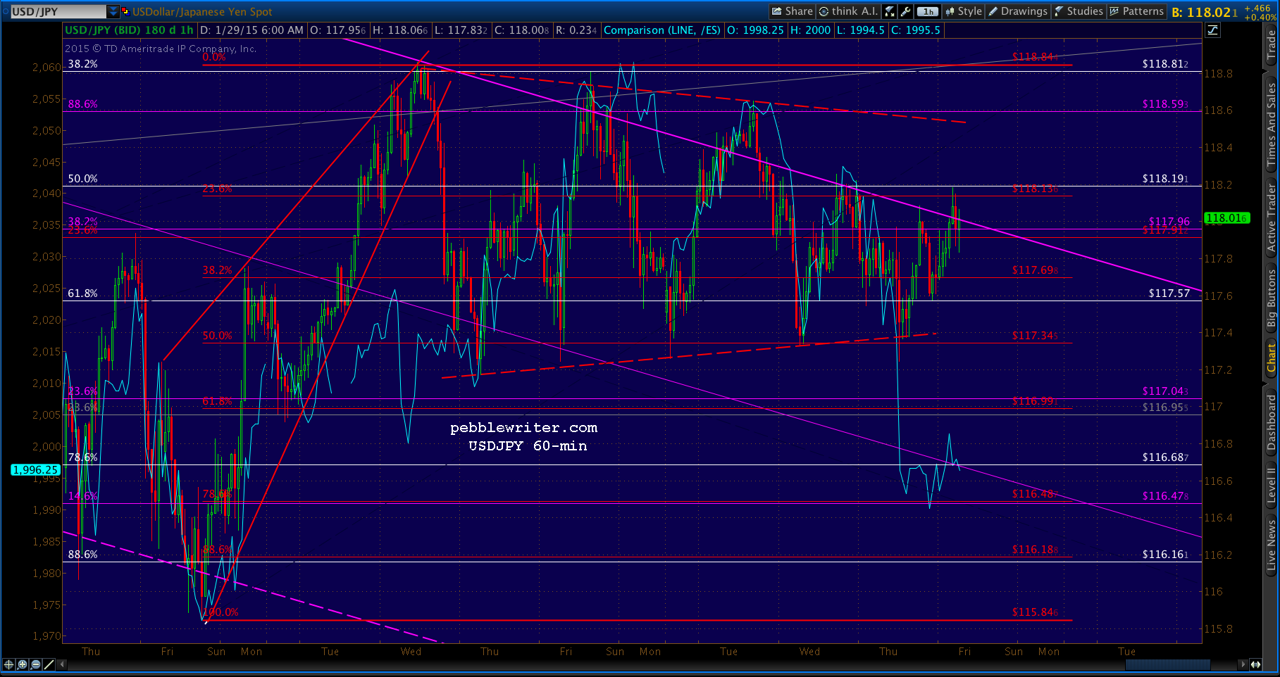 USDJPY popped above the channel top, then scampered back below — leaving SPX without any go juice after backtesting the SMA100. It’s going to try here at the .886 at 1998.88. Note that the left shoulder of our potential IH&S was at 1992.44, so we’ll put a red “S” at the same price — as a reversal here would be symmetrical. A drop below 1988.12 would invalidate the whole pattern.