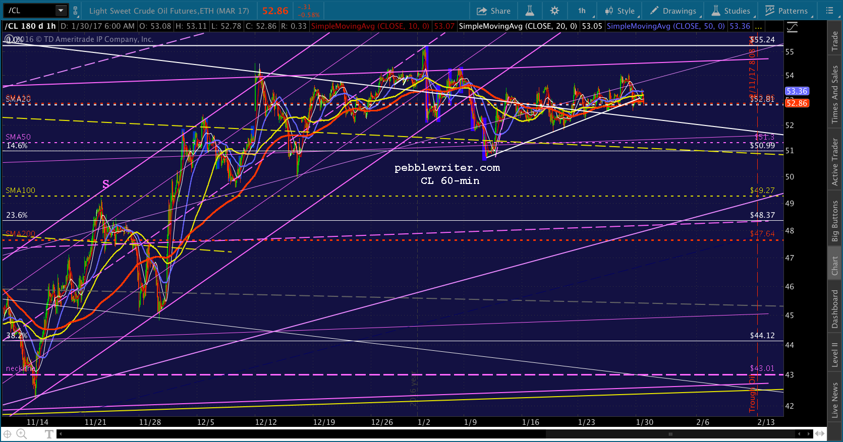 CL’s SMA10 (52.86) is barely above the SMA20 at 52.81. I expect the tumble to start any time, now, with a moving average cross being the first actual signal.