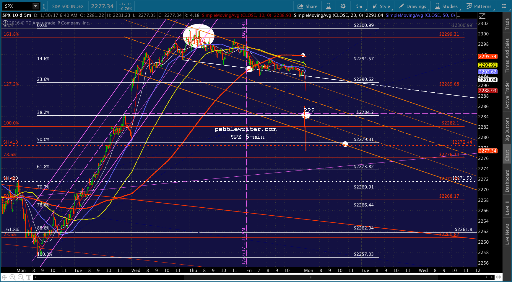 The falling red channel that ES was so careful to preserve on Friday has expanded as expected. Now, the rising white TL can come in to play (or not.) ES SMA10 is at 2274.88, wish is relatively slightly higher than SPX’s at 2278.44.