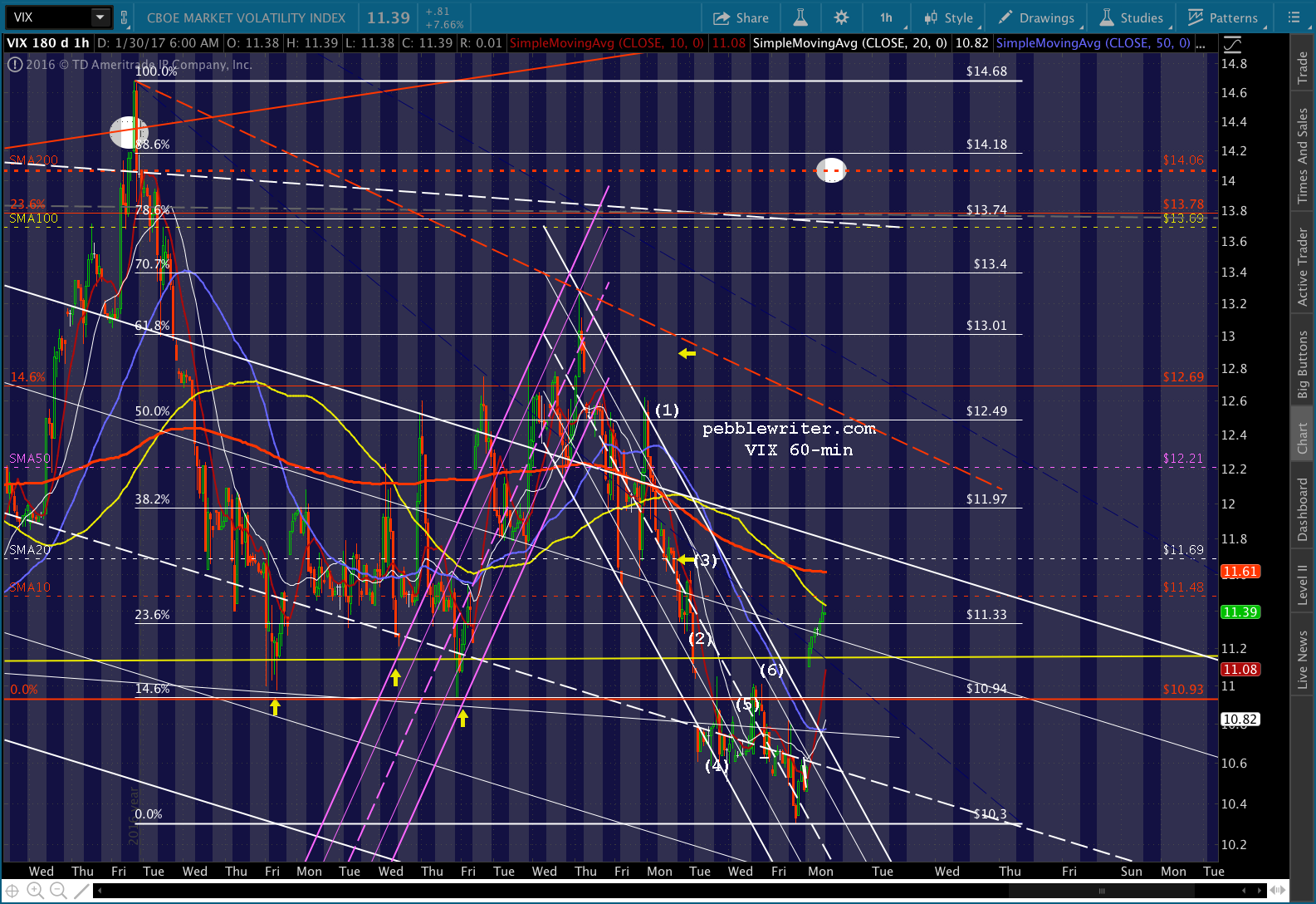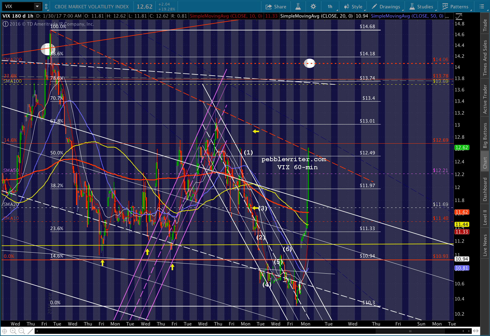 One last set of charts before I get on the road. SPX has broken back below the .618, triggering another short positions. Note that VIX is nudging above the TL, even as USDJPY tags the channel backtest and CL continues its weakness. I’d keep a close eye on USDJPY for signs of a bounce, and VIX for signs of a beat down. But, as long as SPX remains below 2273.82 — the .618 and white neckline — your stance should be short. Remember the potential bounce at 2262 and it should be a profitable day. GLTA.