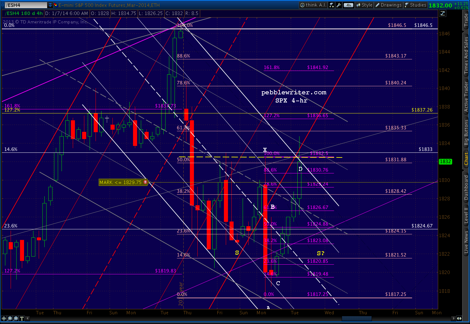 ES and SPX are zeroing in on their .618’s: 1835 and 1840 respectively. A reversal here would set up a potential Gartley or Bat at the .786 or .886 — the deeper retrace we’ve discussed.