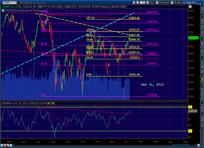In short, the situation is very analogous to SPX. Either the market turns very soon and pays off some of these negative short and medium-term signals, or we could get a last little bump up to the TL off the May 2 highs. So, if we break through 2718 and the previous high (2753), look for a run up to 2812 (the .886 on the combined patterns) or 2838.