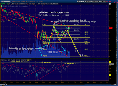 Yesterday, XLF tagged the .886 of an apparent Bat pattern and is now reversing. Recall that its Point B slightly exceeded the .618 Fib that’s the limit for both Gartleys and Bats. But, we had a trend line off the Feb highs that argued for a reversal at the .786 at 13.65.