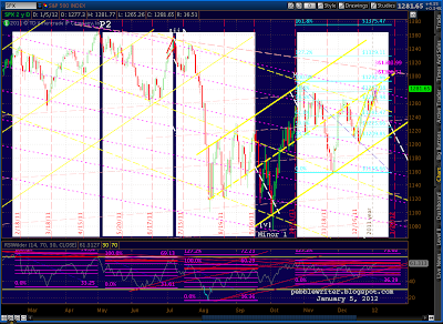 With this last little spurt, SPX tagged again the major channel midline (yellow, dashed), completed a double top (triple if we count 1292) and completed a little Butterfly pattern that looks ready to reverse.