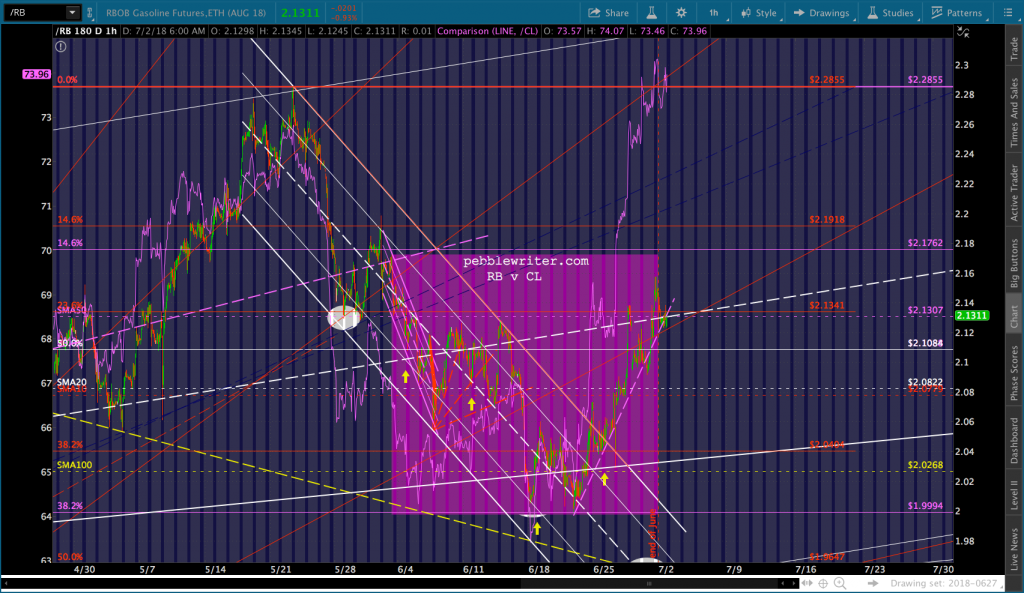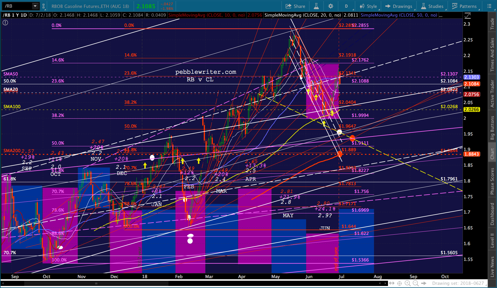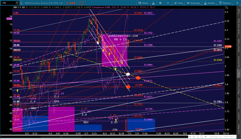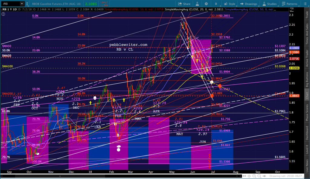 A good start, assuming RB can drop through its SMA10. Note that the SMA200 is now up to the red .618 at 1.889. I’ve added a second target at about 1.9365, however, to reflect the possibility that TPTB deem a backtest of the purple channel top too important to pass up.