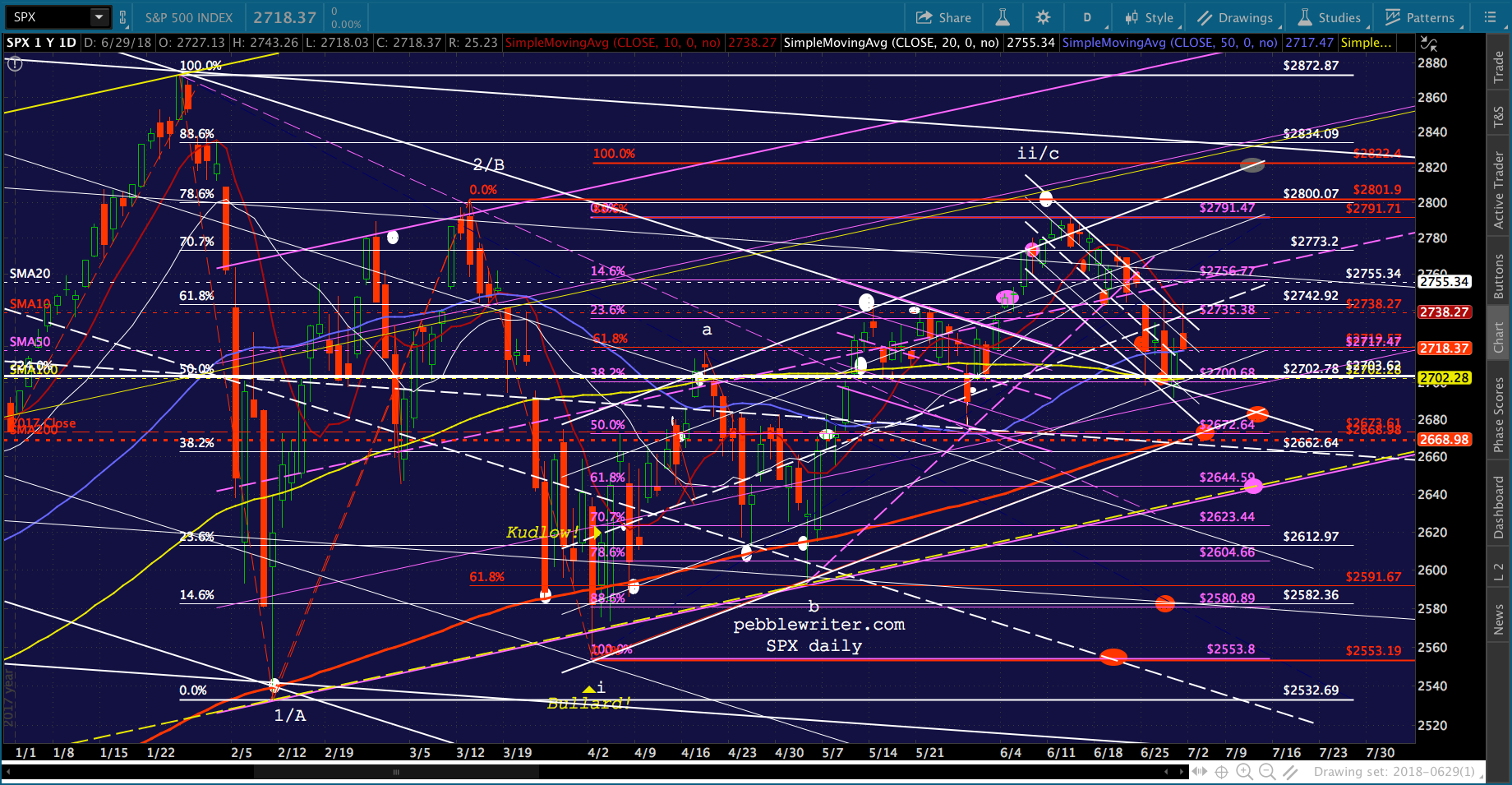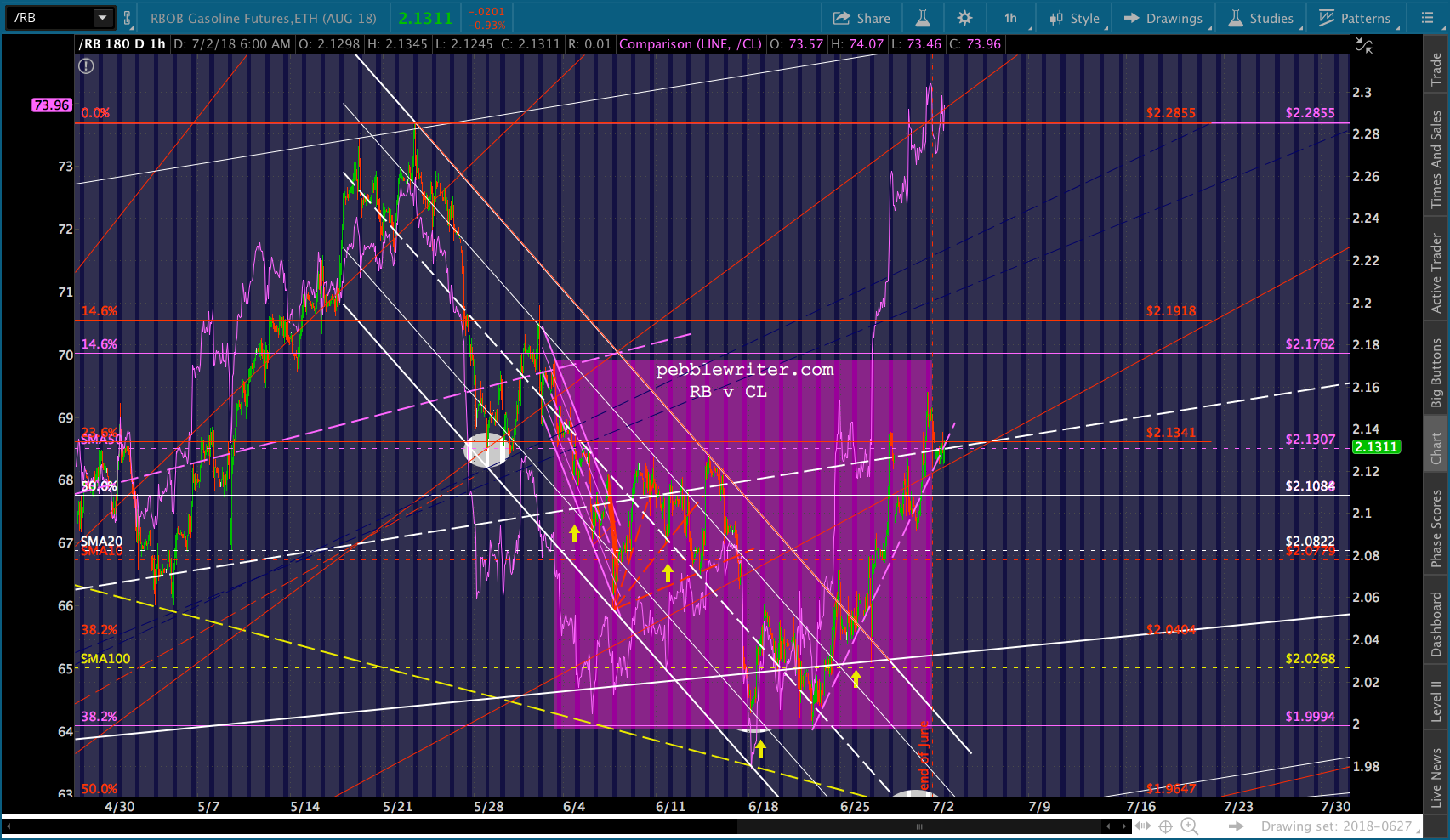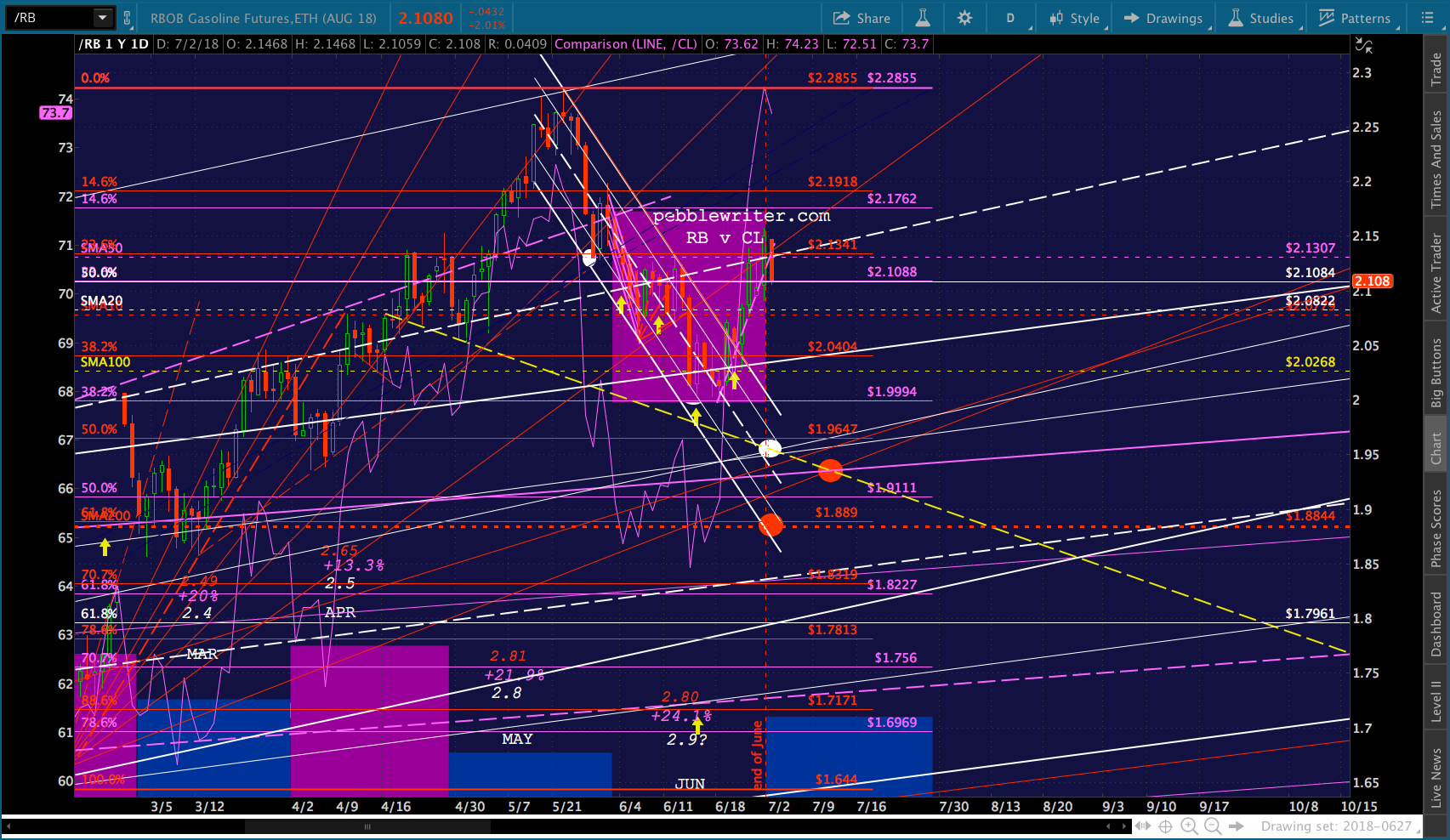 A good start, assuming RB can drop through its SMA10. Note that the SMA200 is now up to the red .618 at 1.889. I’ve added a second target at about 1.9365, however, to reflect the possibility that TPTB deem a backtest of the purple channel top too important to pass up.
