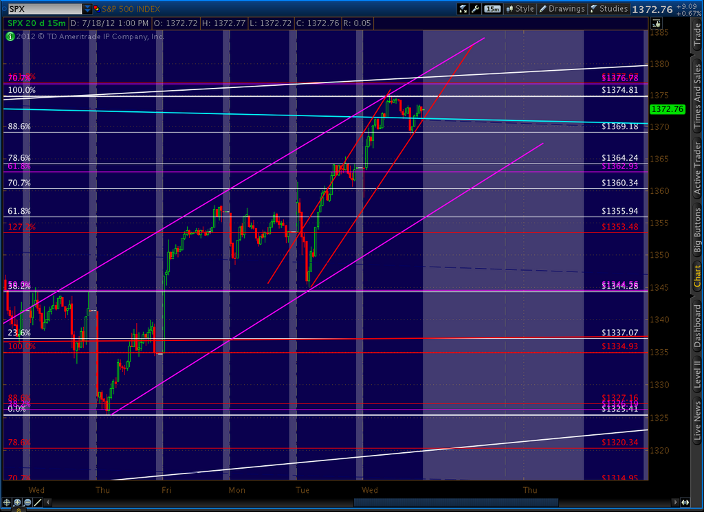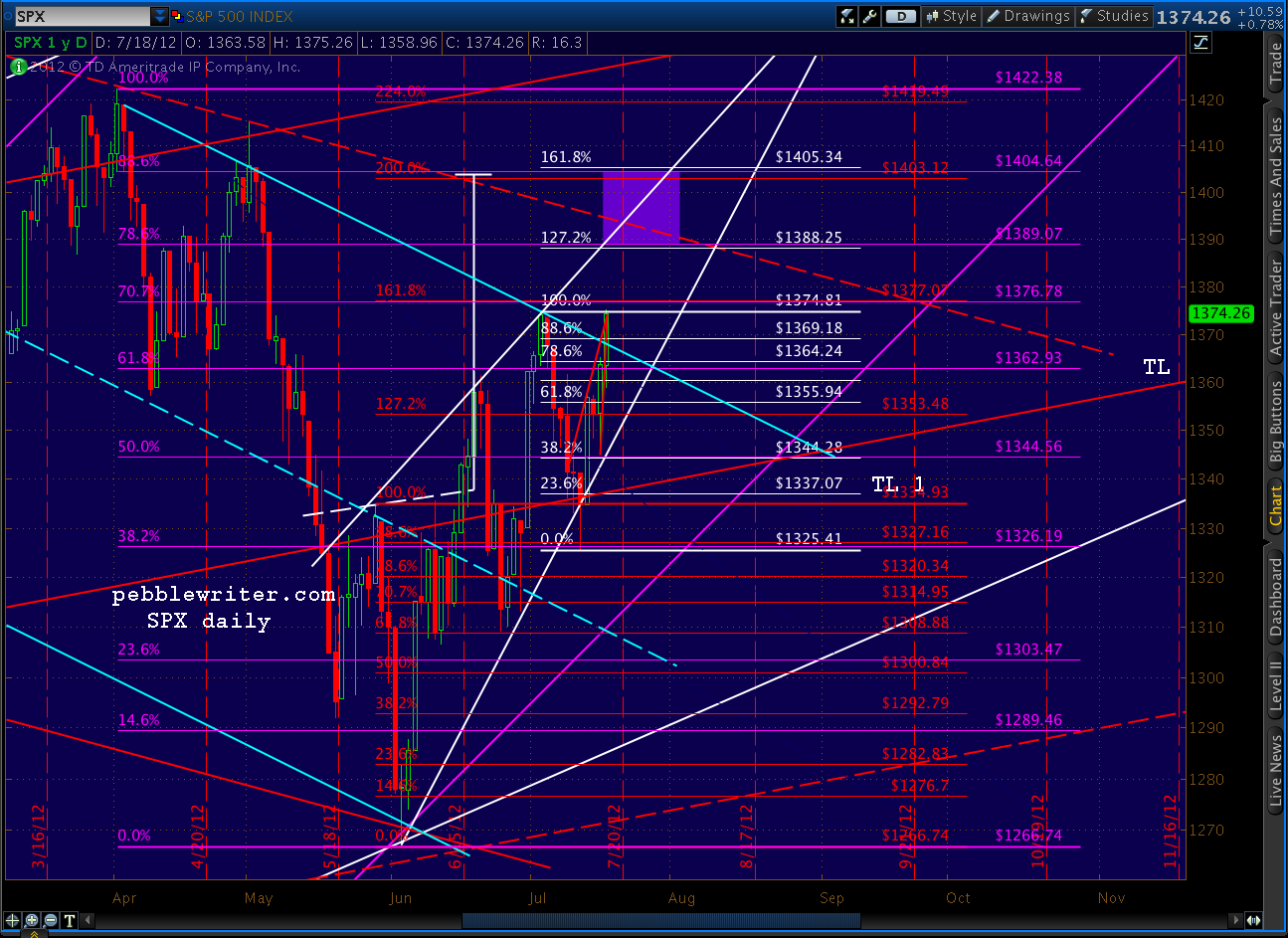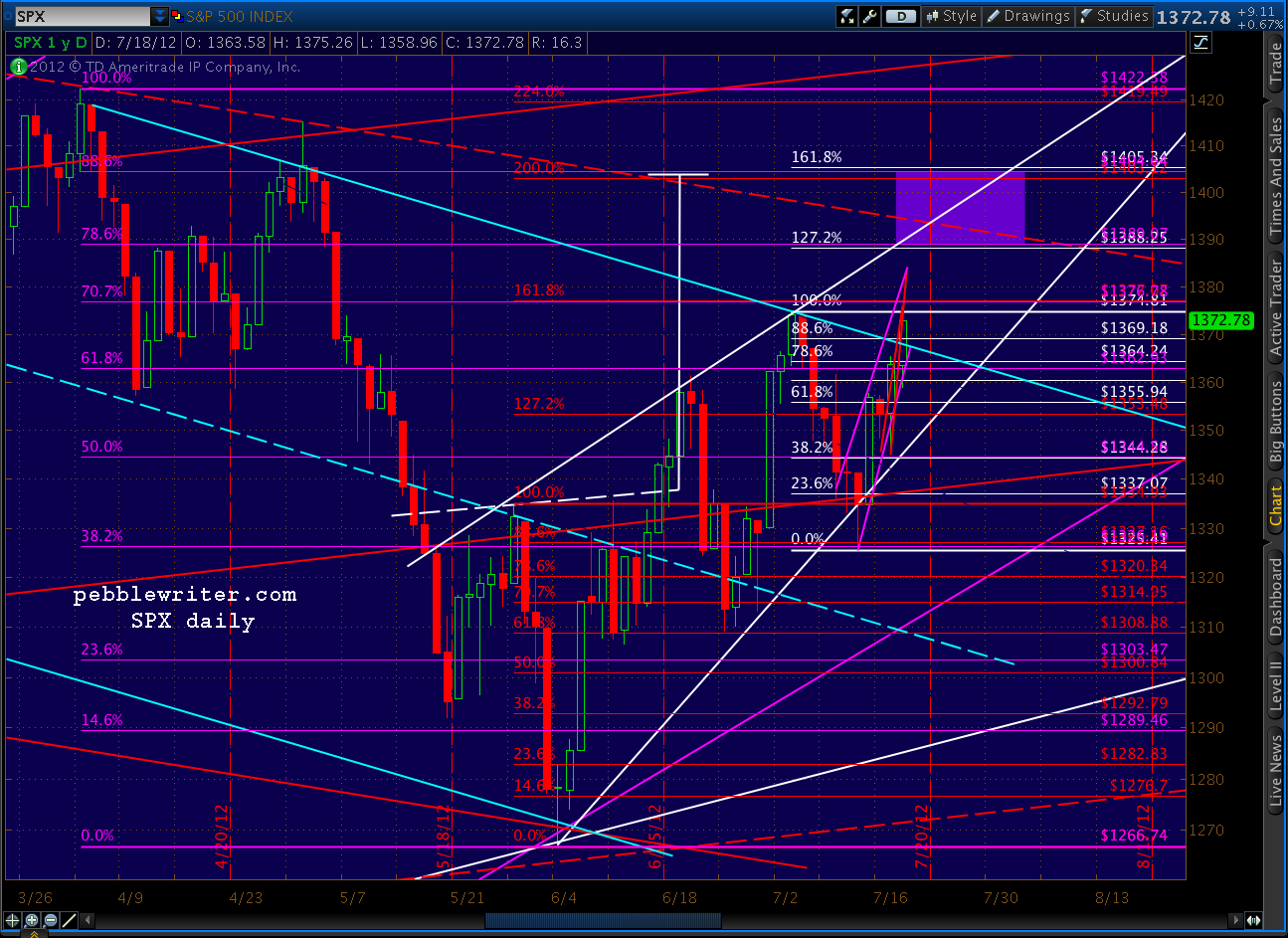 We did get the pull back to 1370 discussed above (actually 1368.70) but didn’t quite reach our 1377 harmonics, falling less than 2 points short of the 1.618 and the .707 discussed above. But, importantly, we closed above the trend line I was worried about.