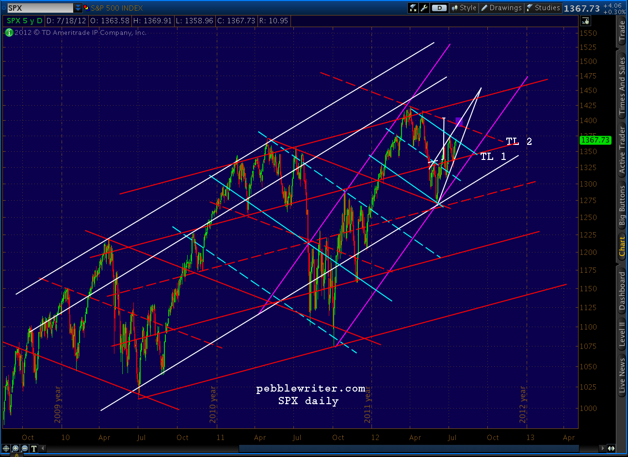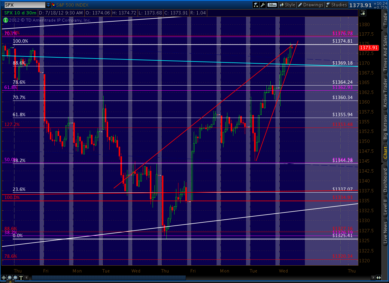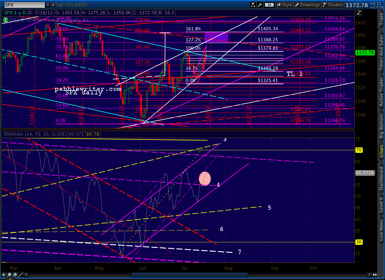 We did get the pull back to 1370 discussed above (actually 1368.70) but didn’t quite reach our 1377 harmonics, falling less than 2 points short of the 1.618 and the .707 discussed above. But, importantly, we closed above the trend line I was worried about.