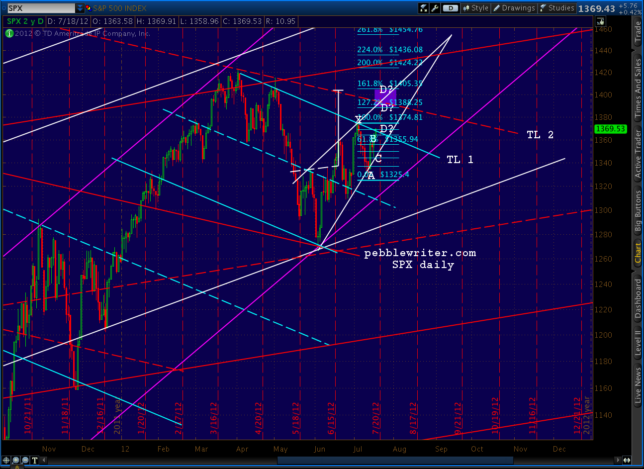 In the time it took to type and post that, SPX reversed and zoomed up to tag the lower trend line off the 1422 high (remember, there is a higher TL, too.) This coincides with the .886 of the pattern we discussed above at 1369.18.