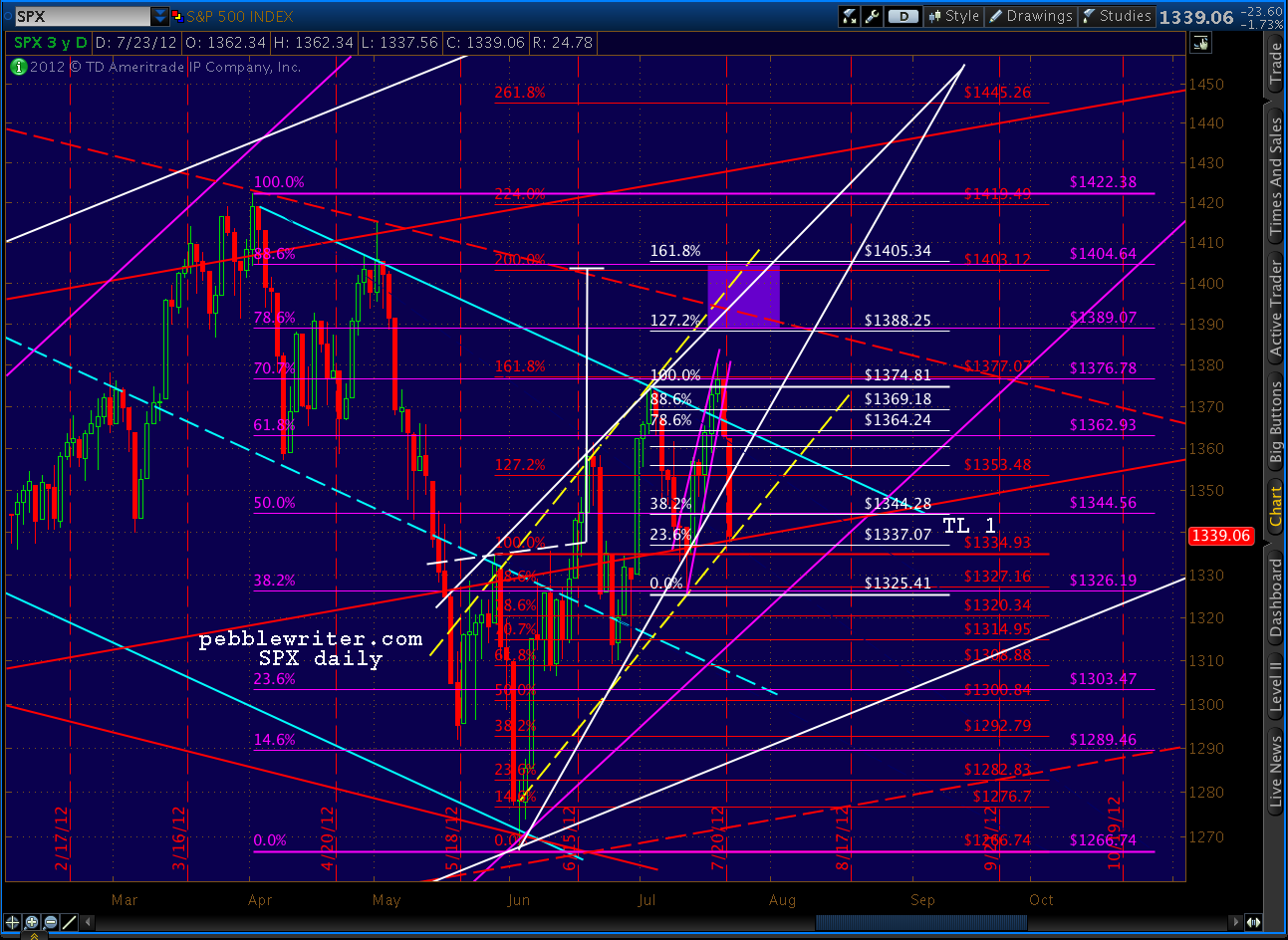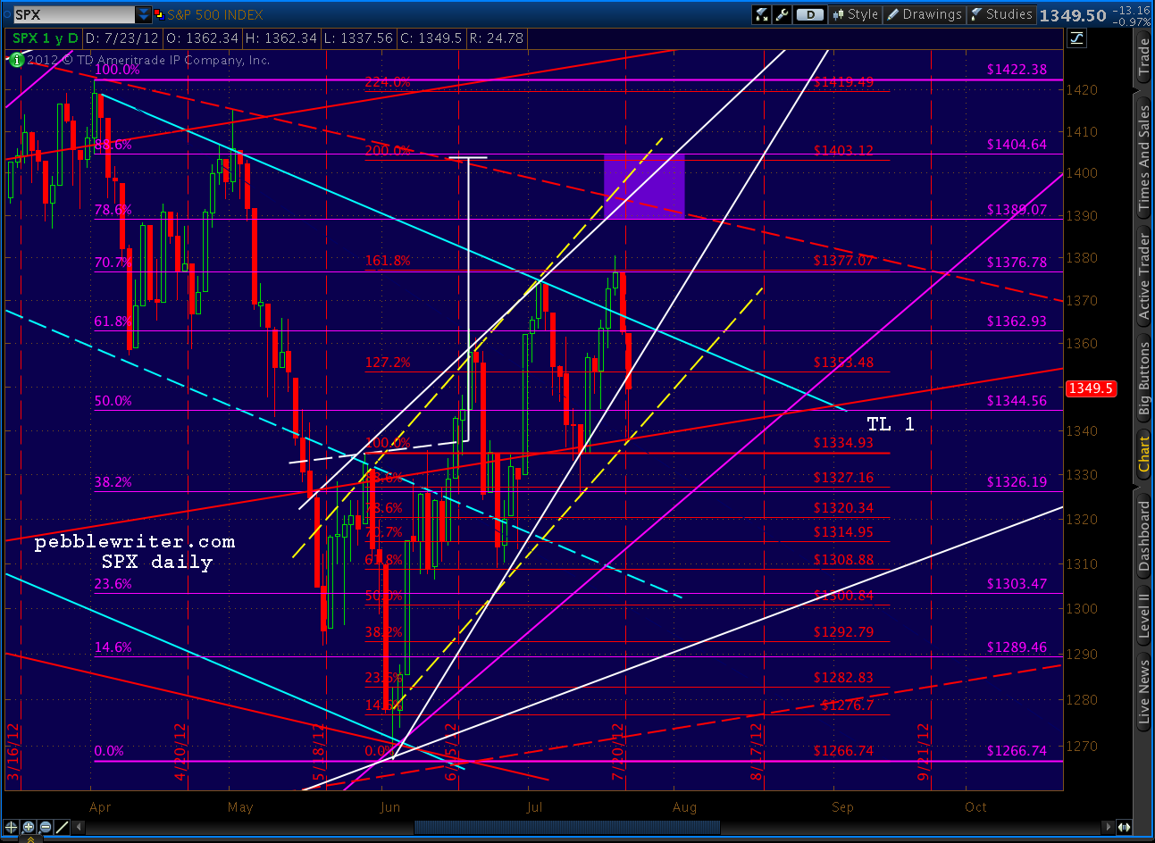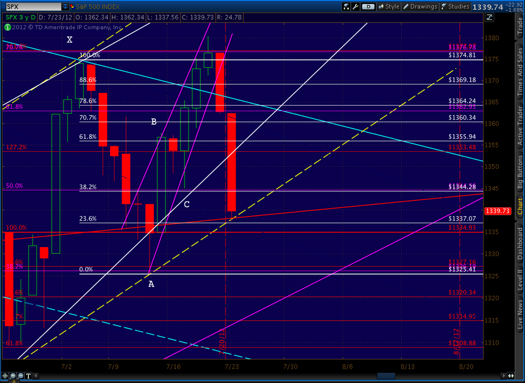 BTW, I’m removing the small white harmonic grid. This morning’s plunge officially did it in when we established a lower price than the presumed Point C at 1345 on Jul 17. This lower price would have to be the new Point C, which means that our presumed Point B was also no good. We would have to move it to July 19’s 1380, which would be higher than Point X — a definite no-no.