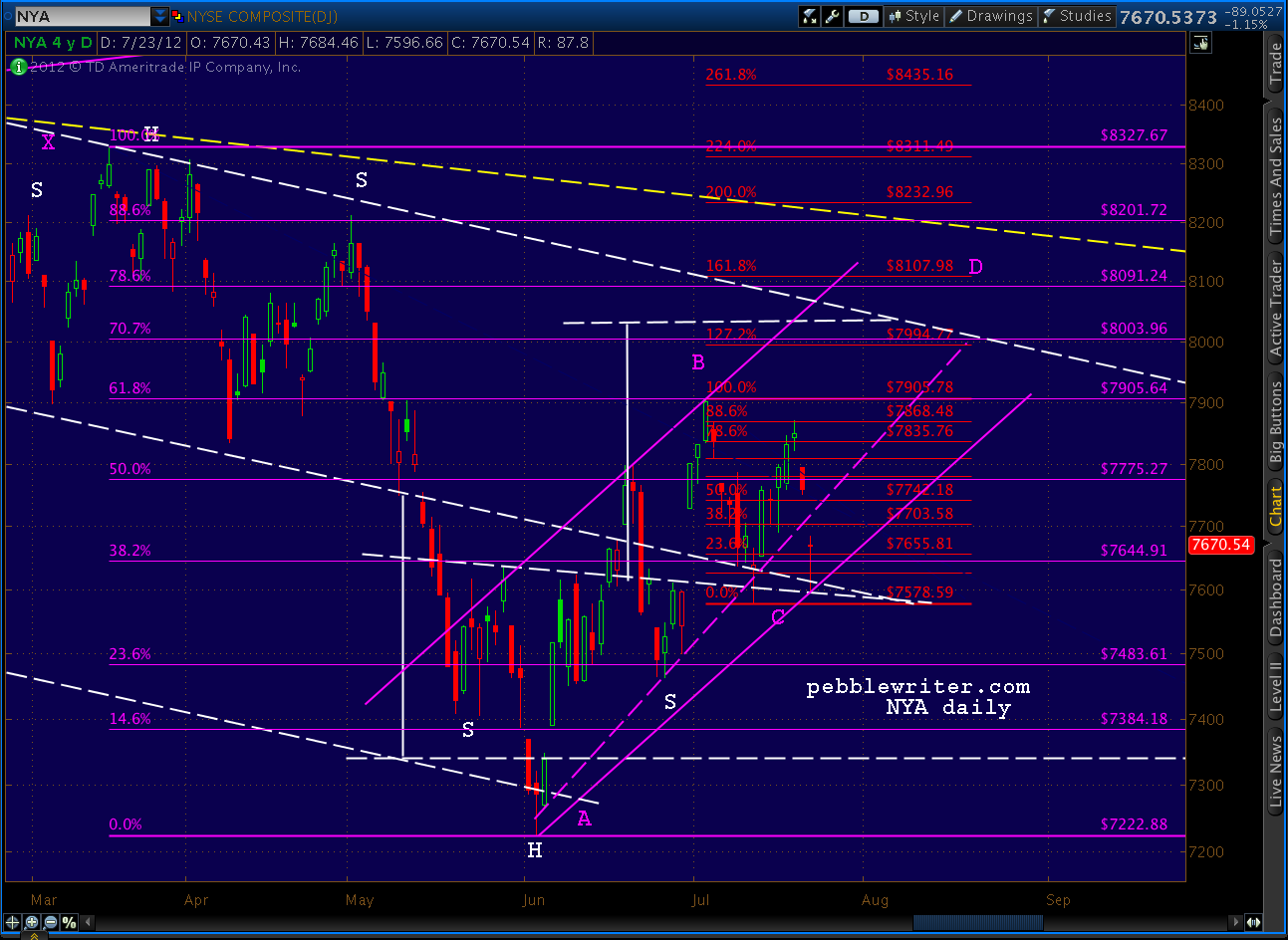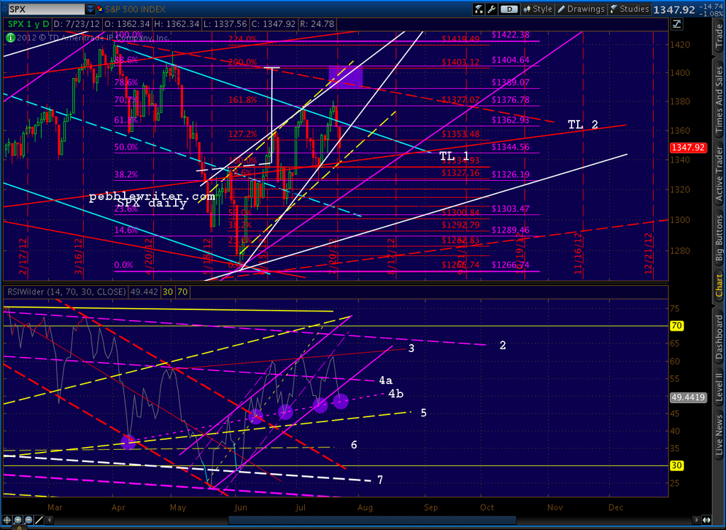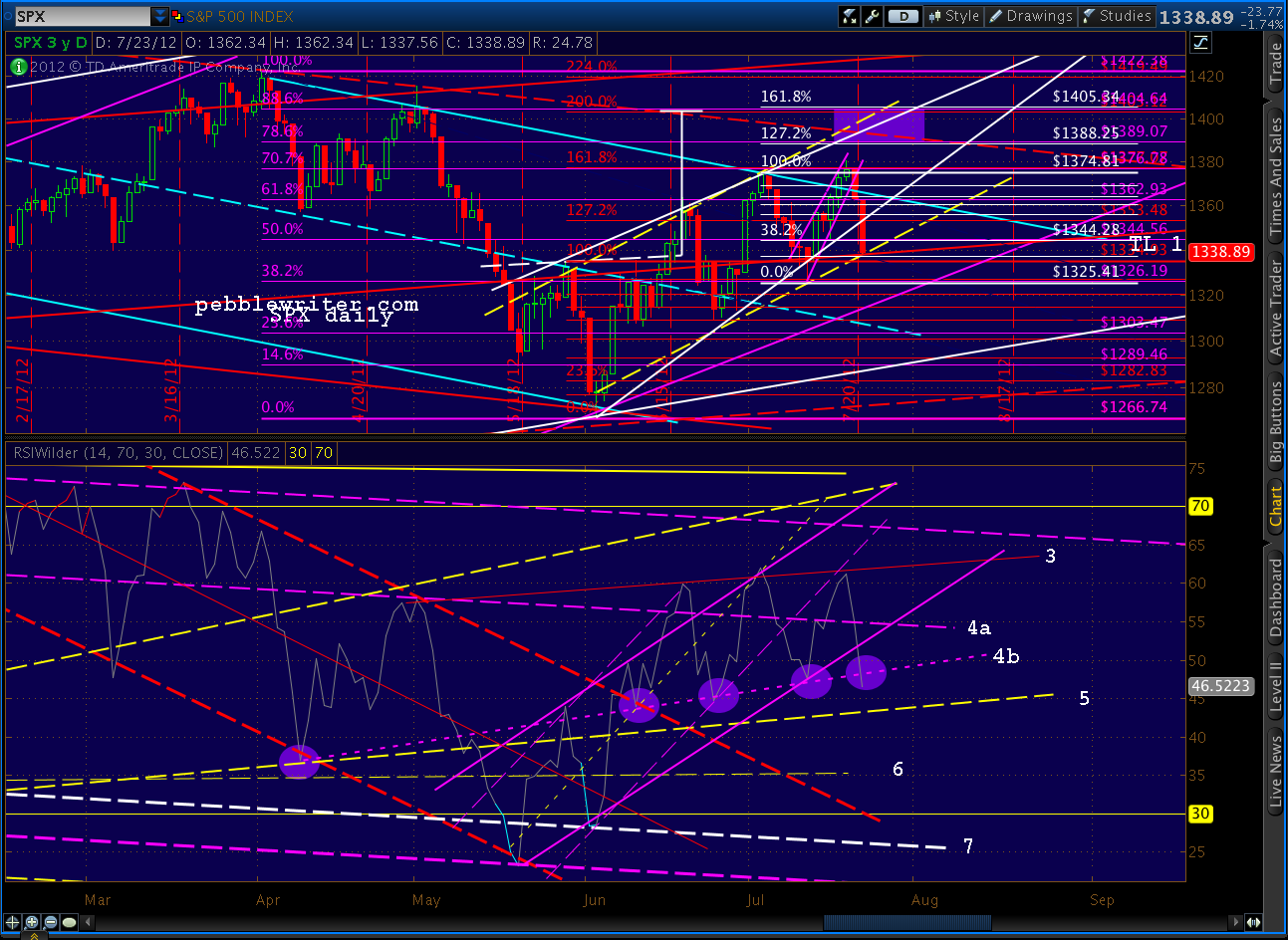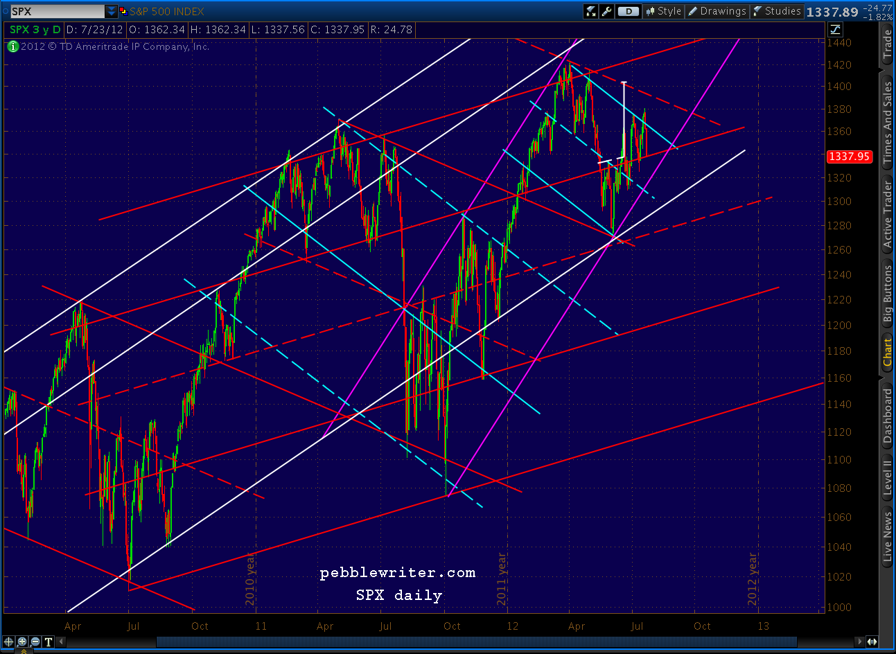 BTW, I’m removing the small white harmonic grid. This morning’s plunge officially did it in when we established a lower price than the presumed Point C at 1345 on Jul 17. This lower price would have to be the new Point C, which means that our presumed Point B was also no good. We would have to move it to July 19’s 1380, which would be higher than Point X — a definite no-no.