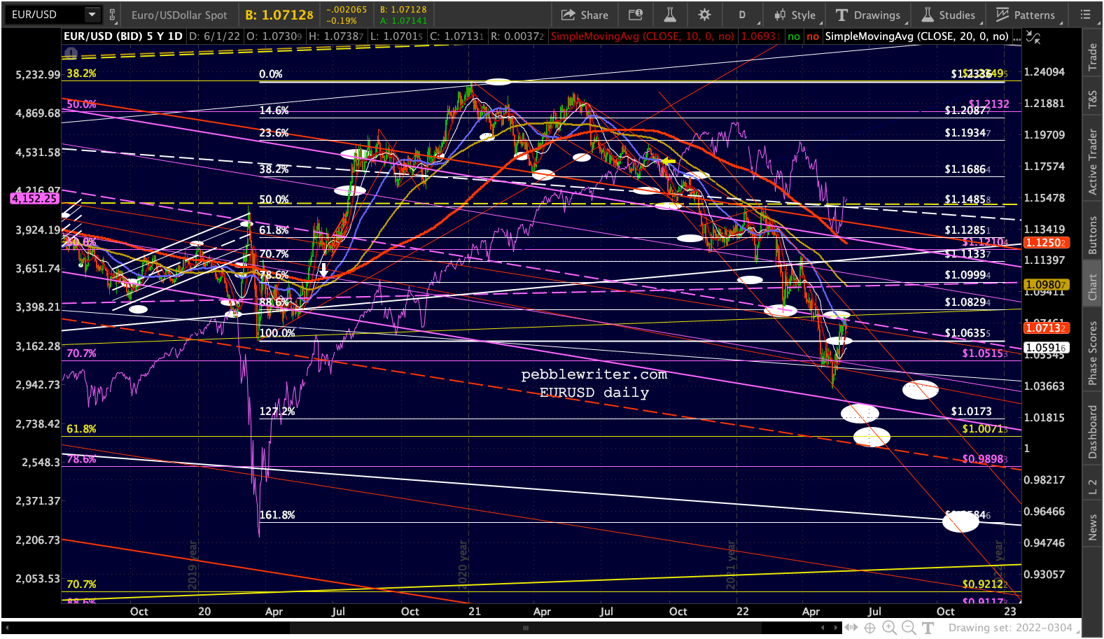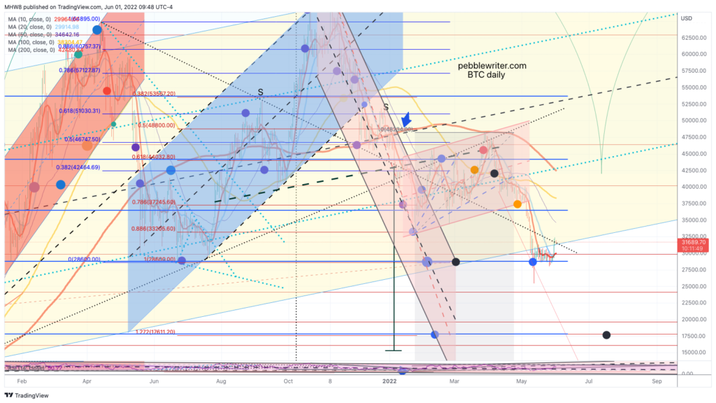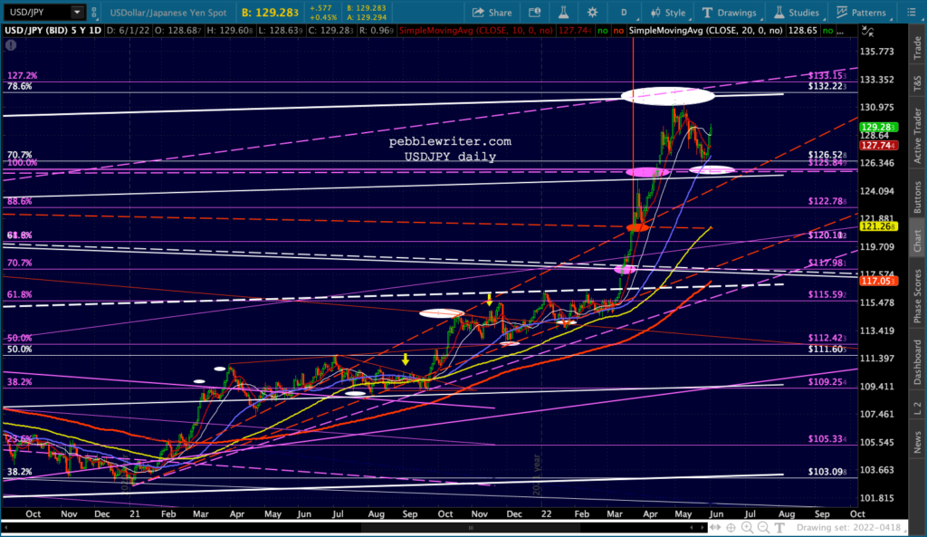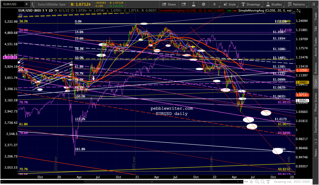I’ve made a few adjustments in the EURUSD chart, reflecting a drop to 1.0173 and possibly 1.0071 by mid-July and subsequent bounce to flesh out the top of the red channel into September before crashing below par into year end.