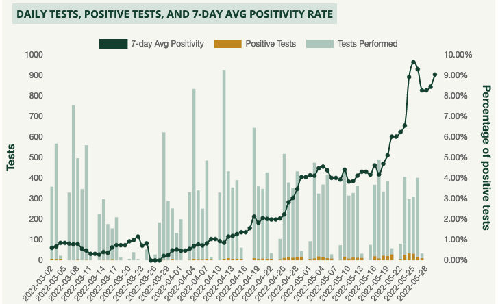 Futures are moderately higher this morning as algos respond enthusiastically to Salesforce’s earnings and ignore the ongoing meltdown in mortgage applications and uptick in COVID cases. Here’s a snapshot of testing results at my daughter’s college, which finally reinstated a mask mandate after the positivity rate reached 10%.