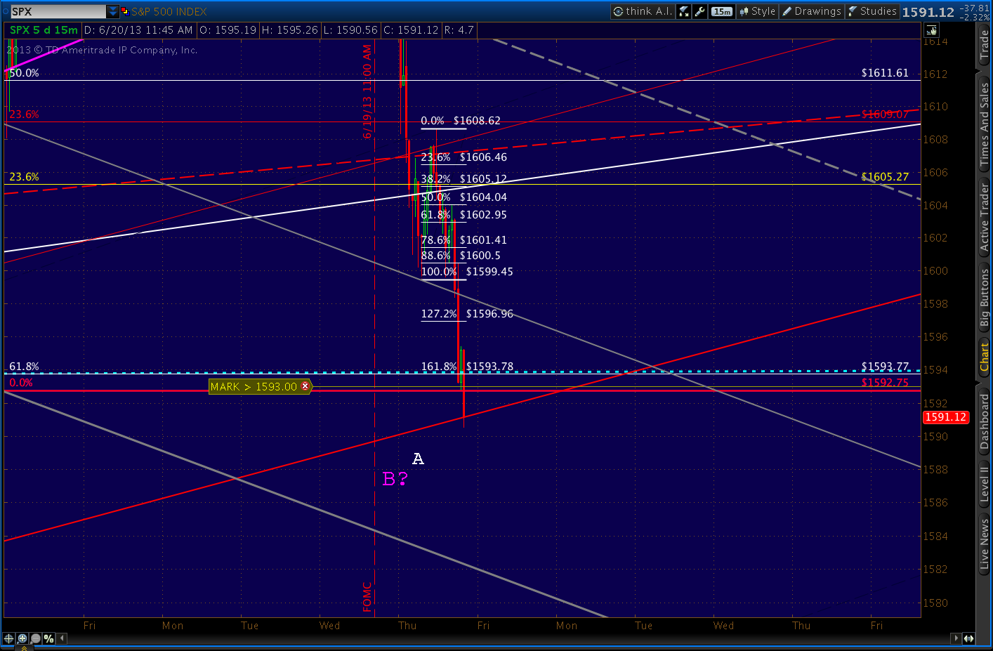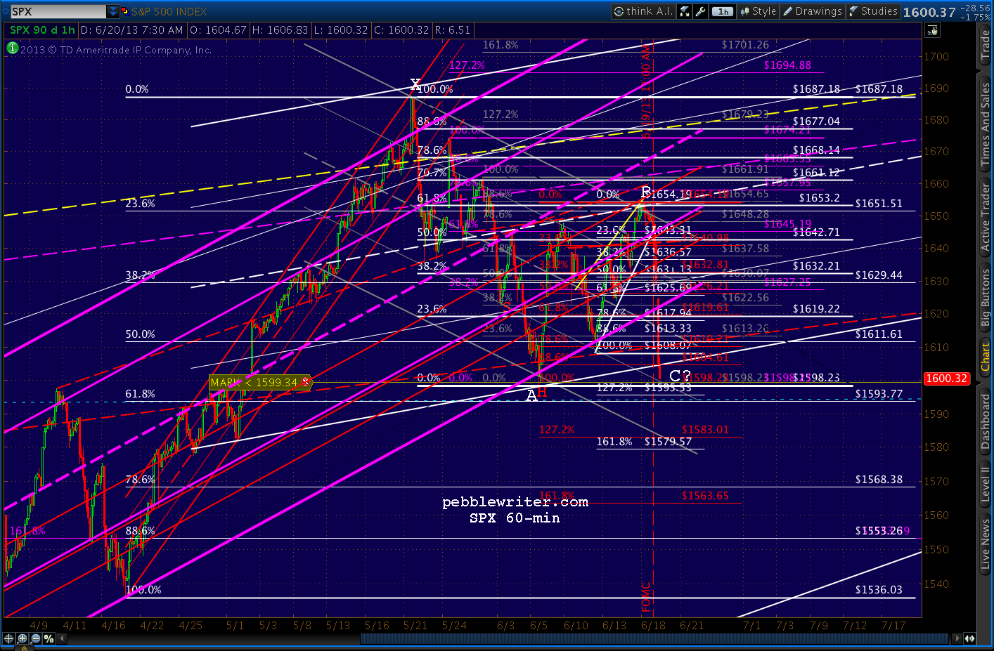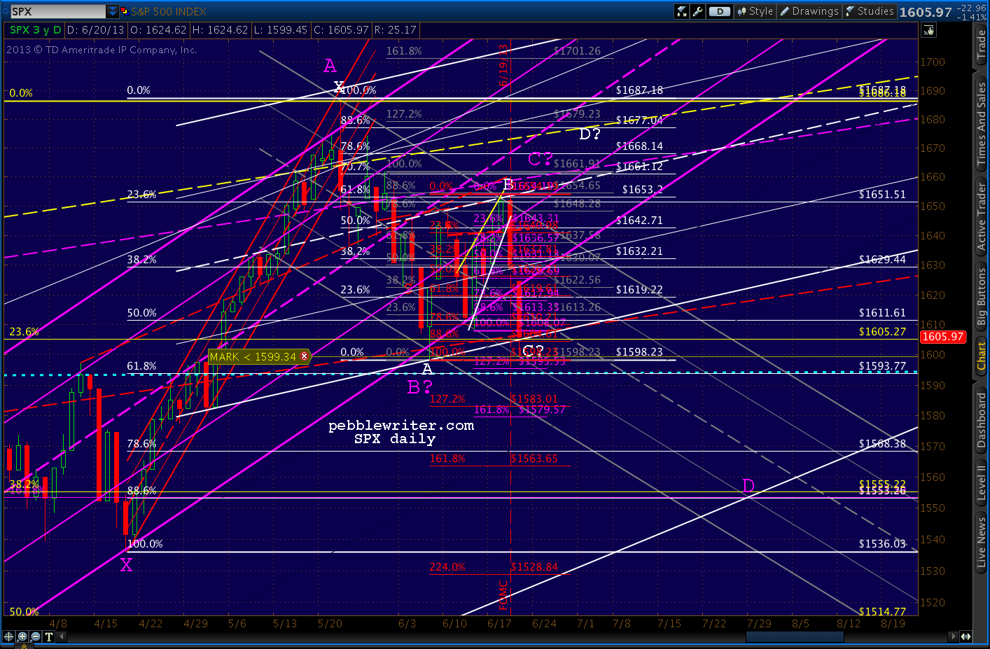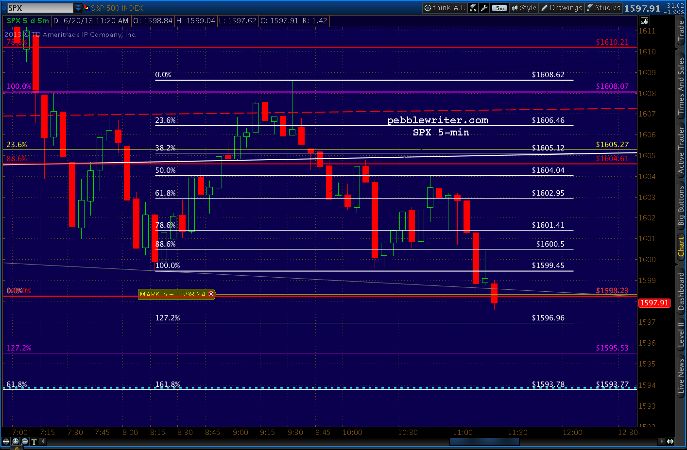 BTW,I realized when going long at 1608 that SPX could fall further towards 1598 — especially with the .886 at 1604 — but didn’t feel that shorting for 4 points was worthwhile. Knowing that a break of 1598 would likely mean a drop to only 1593.77 presents the very same 4-pt problem.