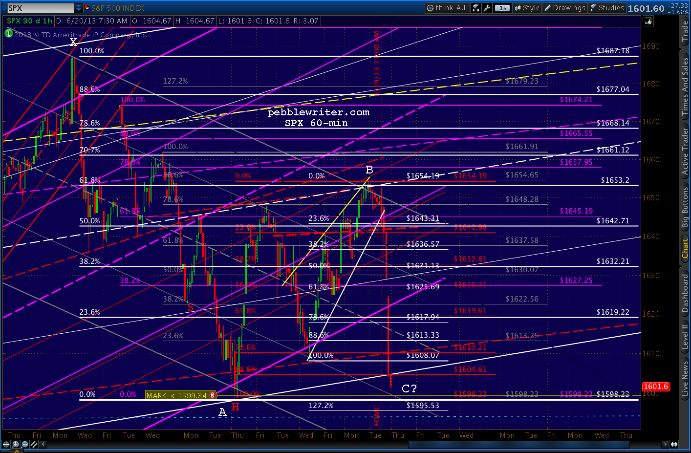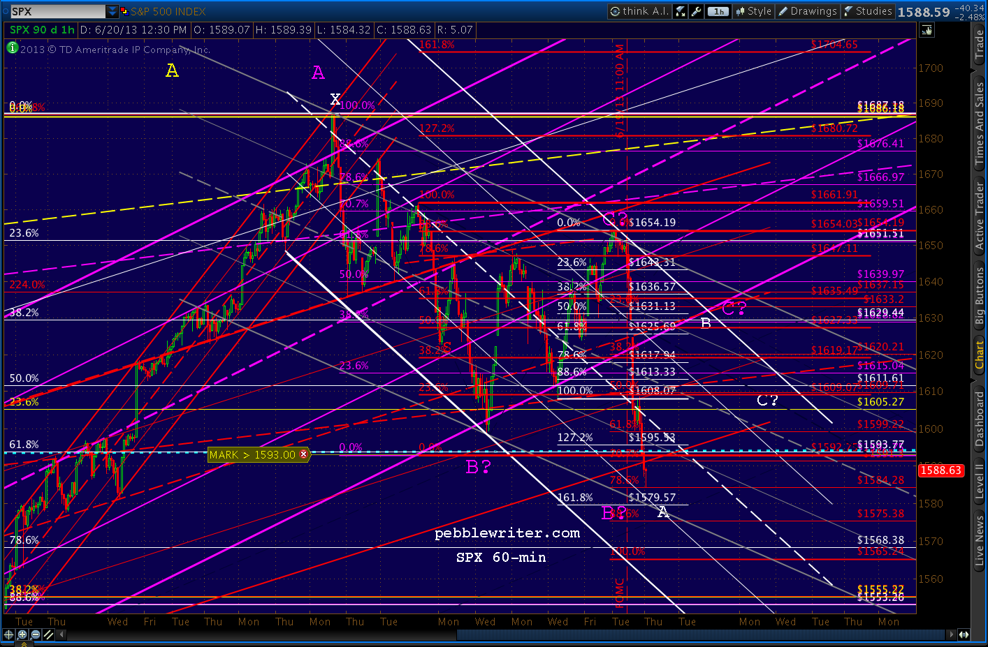 We wondered earlier whether 1598.23 or 1593.77 might be the true Point B in a harmonic pattern. Since we’ve dropped (only slightly, so far) through the .618 at 1593, it increases the odds that 1598 was the true Point B at just shy of the .618, and that 1654 was Point C (technically, Bat Patterns must have a Point B at less than the .618 — not greater than or equal to.)