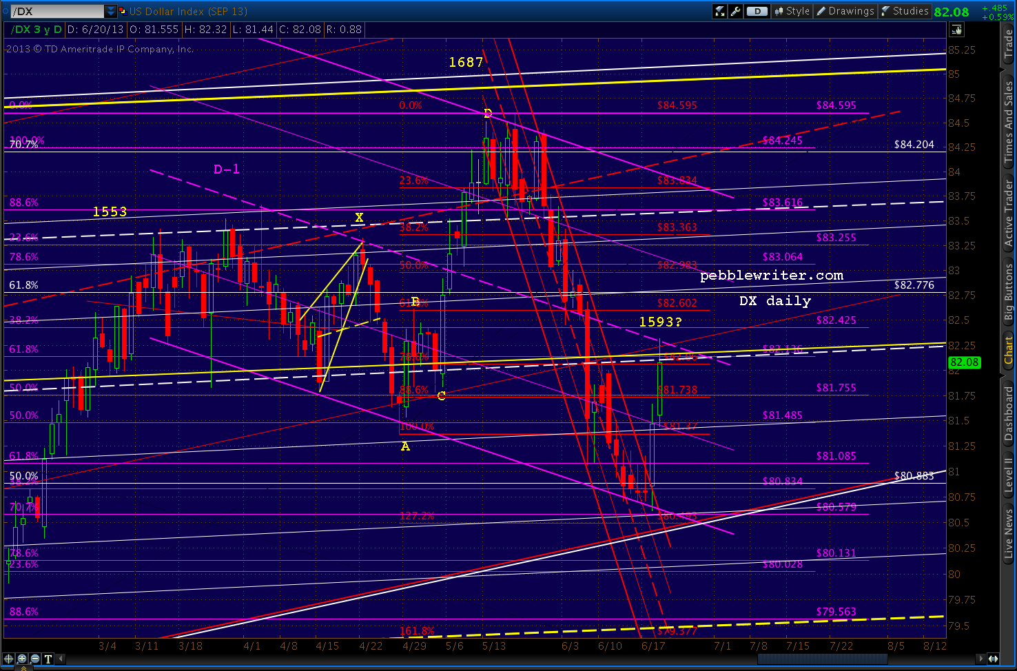 The bearish scenario is that SPX bumps up slightly here, but continues its slide to the white .786 (1568) or .886 (1553) and doesn’t catch a bid — extending to the .618 of the 1343 to 1687 rally at 1474 (yes, as in Sept 14, 2012) and ultimately to the .886 at 1382 (yes, the .786 of the 1576 to 666 drop — where May 2011 should have topped out.)