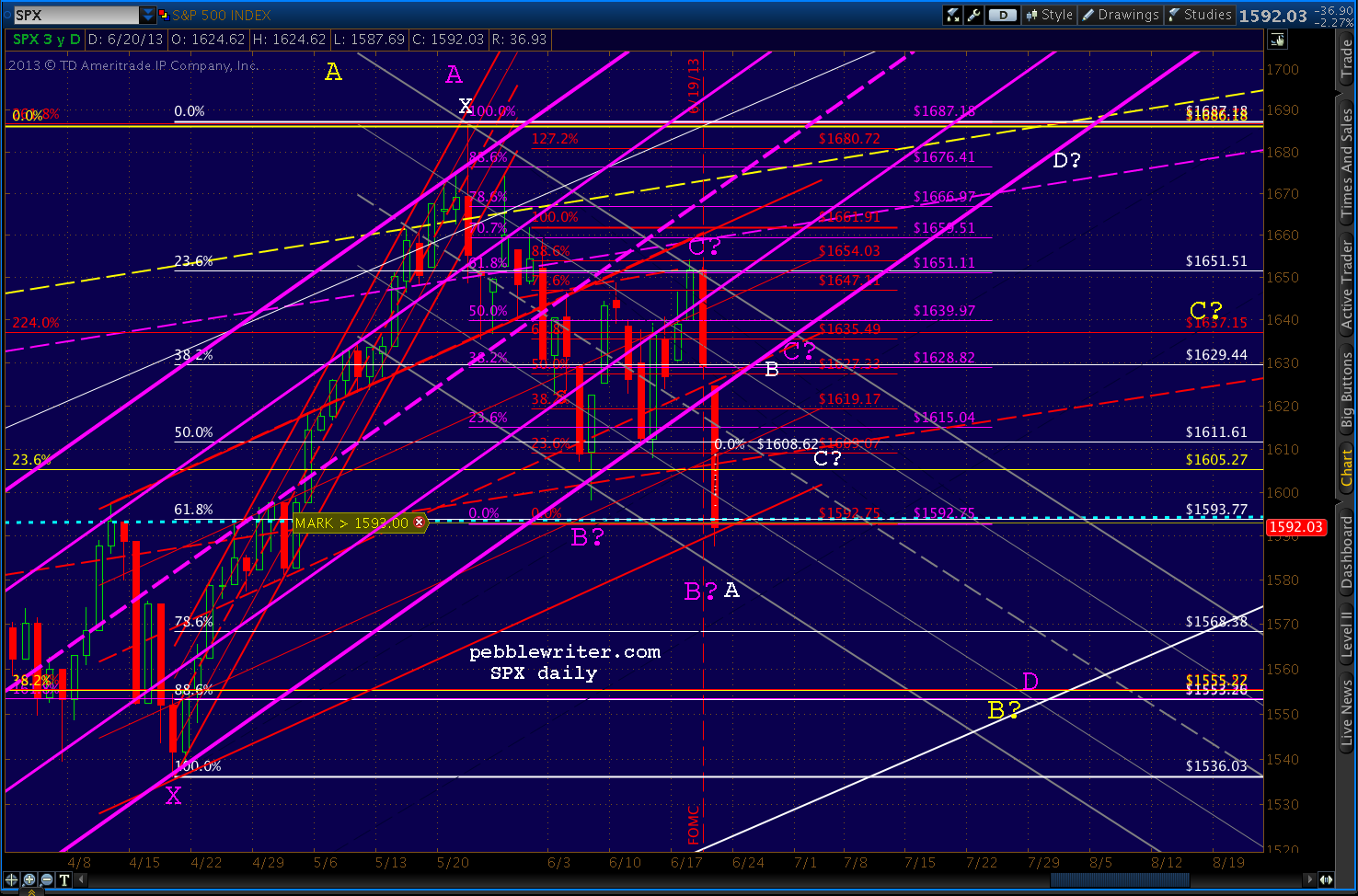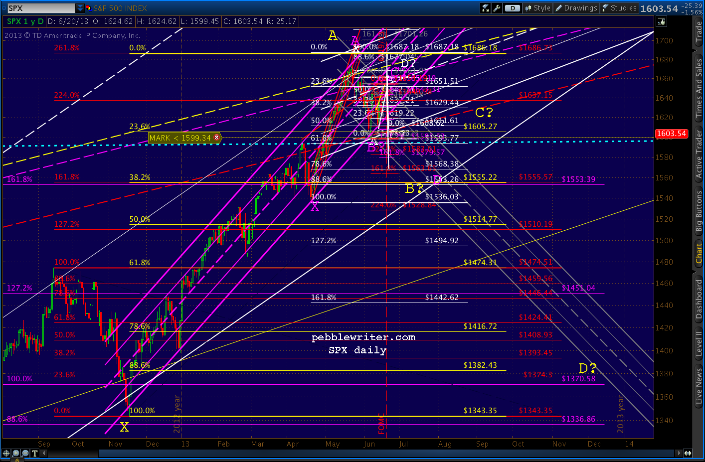 The bullish scenario is that the white Bat pattern plays out. SPX comes to its senses (stays north of 1598), leaps back into the purple channel and goes up to tag 1668 or 1677. In such a scenario, SPX merely backtested (1) the red, dashed TL from 1994/2002 and (2) the TL off the 2000 and 2007 highs. It’s the light blue dotted line below that’s hard to see because it’s hiding behind the white .618 (which makes that 1593.77 tag later today a real possibility.) SPX would reverse off 1668/1677, but just enough to set up the next leg higher to 1823.