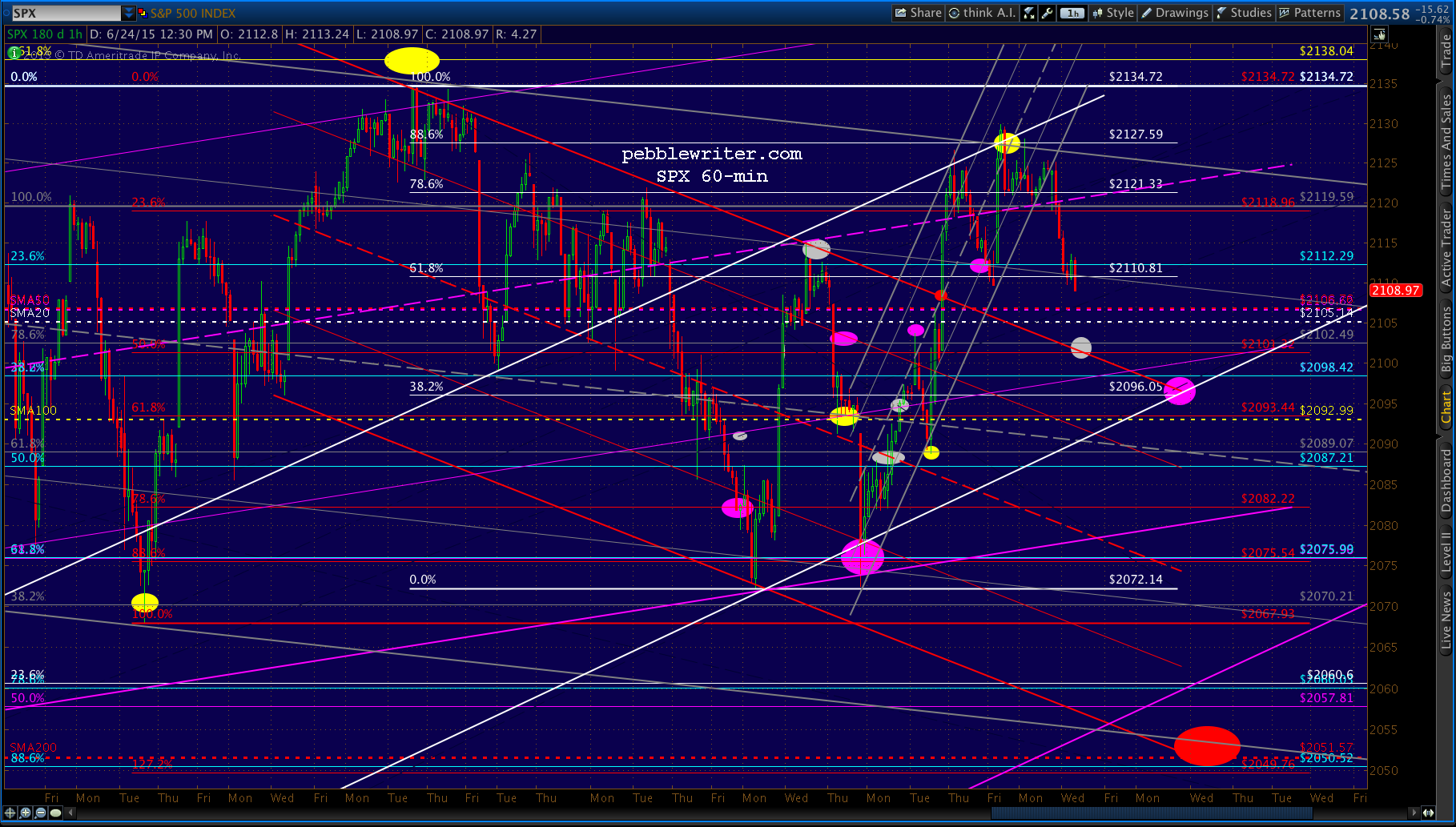 Yesterday’s melt-down was a good start on the Bat Pattern reversal, reaching the white .618 on its way to the cluster of moving averages we discussed yesterday and coming within 3 points of our downside target issued in Monday’s member section [see: Strange Brew]: