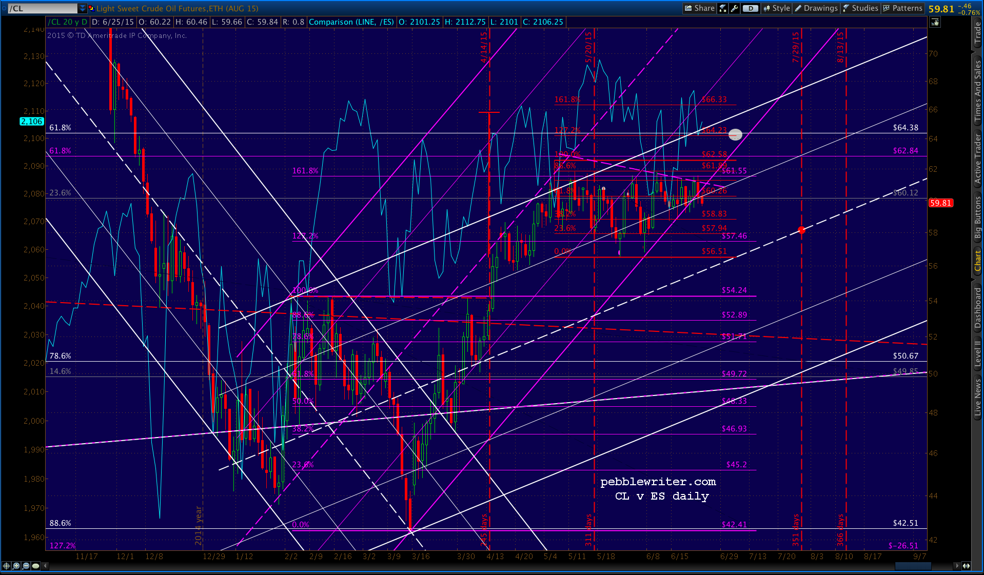 Consider CL, which IMO is breaking down. That purple TL running across the recent highs remains intact and the purple/white channel lines are looking iffy.