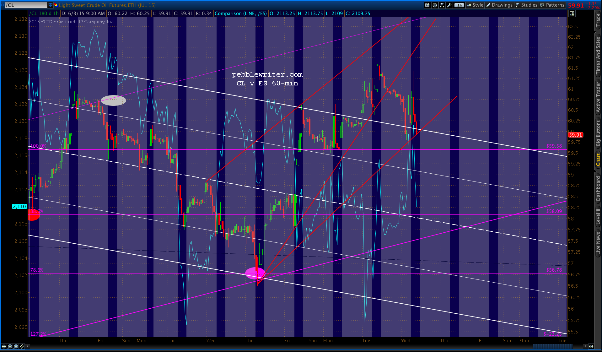 The lower targets still make sense for all the reasons we’ve discussed before. But, we’d have to see CL break back below the falling white channel top (which it’s close to doing)…