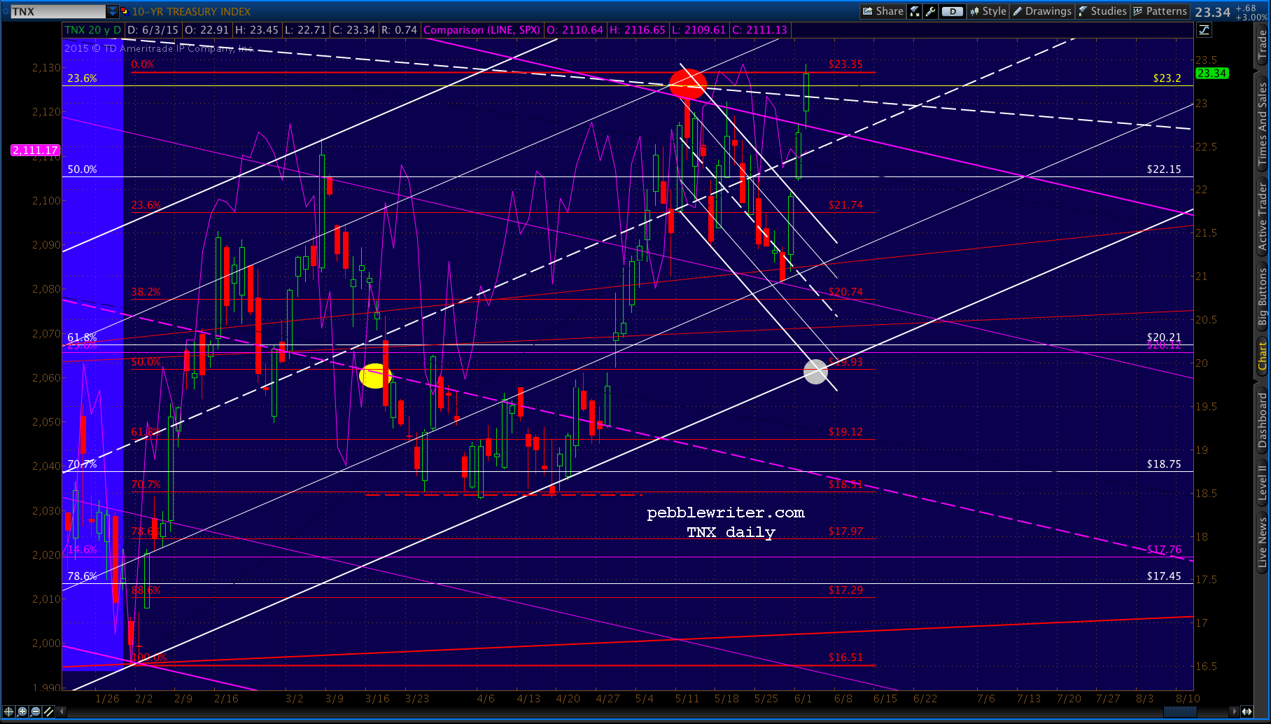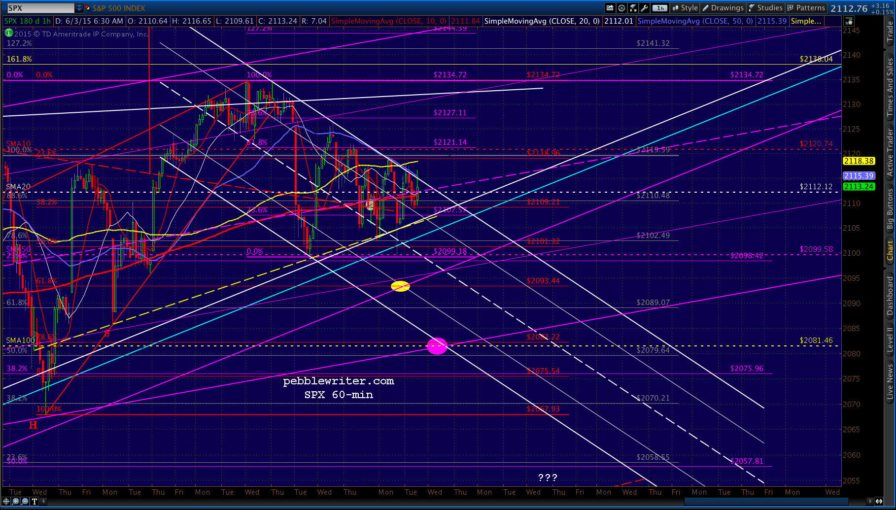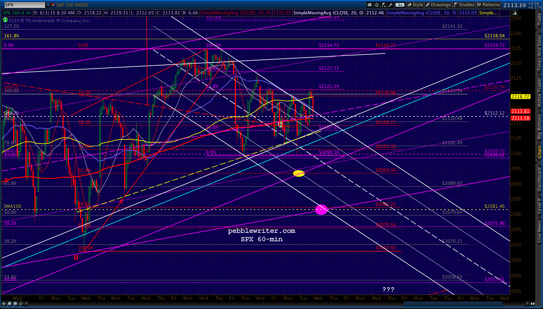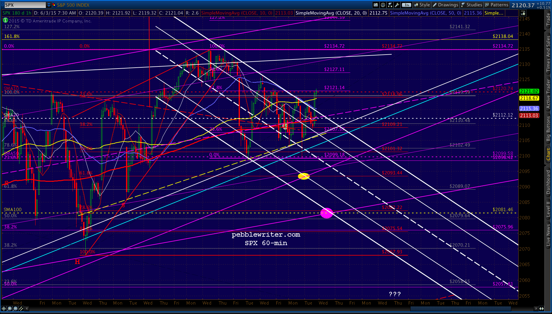 SPX’s spurt up through the white channel top reached the purple .618 and the SMA10, so those looking for a trade might try a short position here at 2121 for a backtest of the broken channel at 2112. Tight stops recommended.